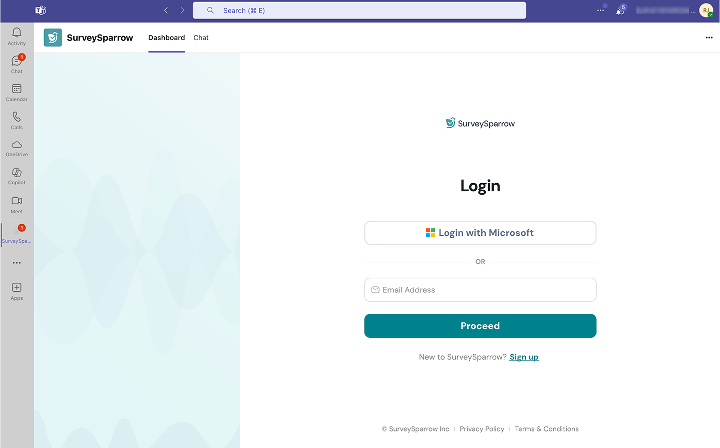 7. You are then taken to the SurveySparrow app. Under the Dashboard section,a login screen appears. Use your Microsoft account or account credentials to complete the login process.