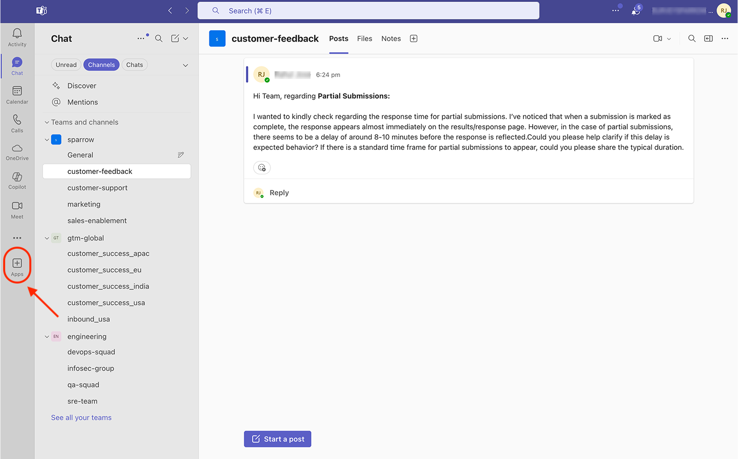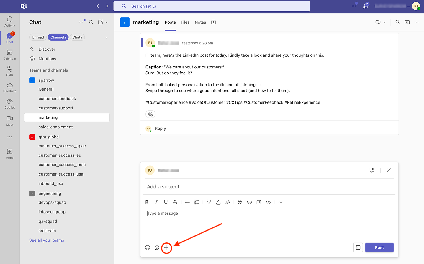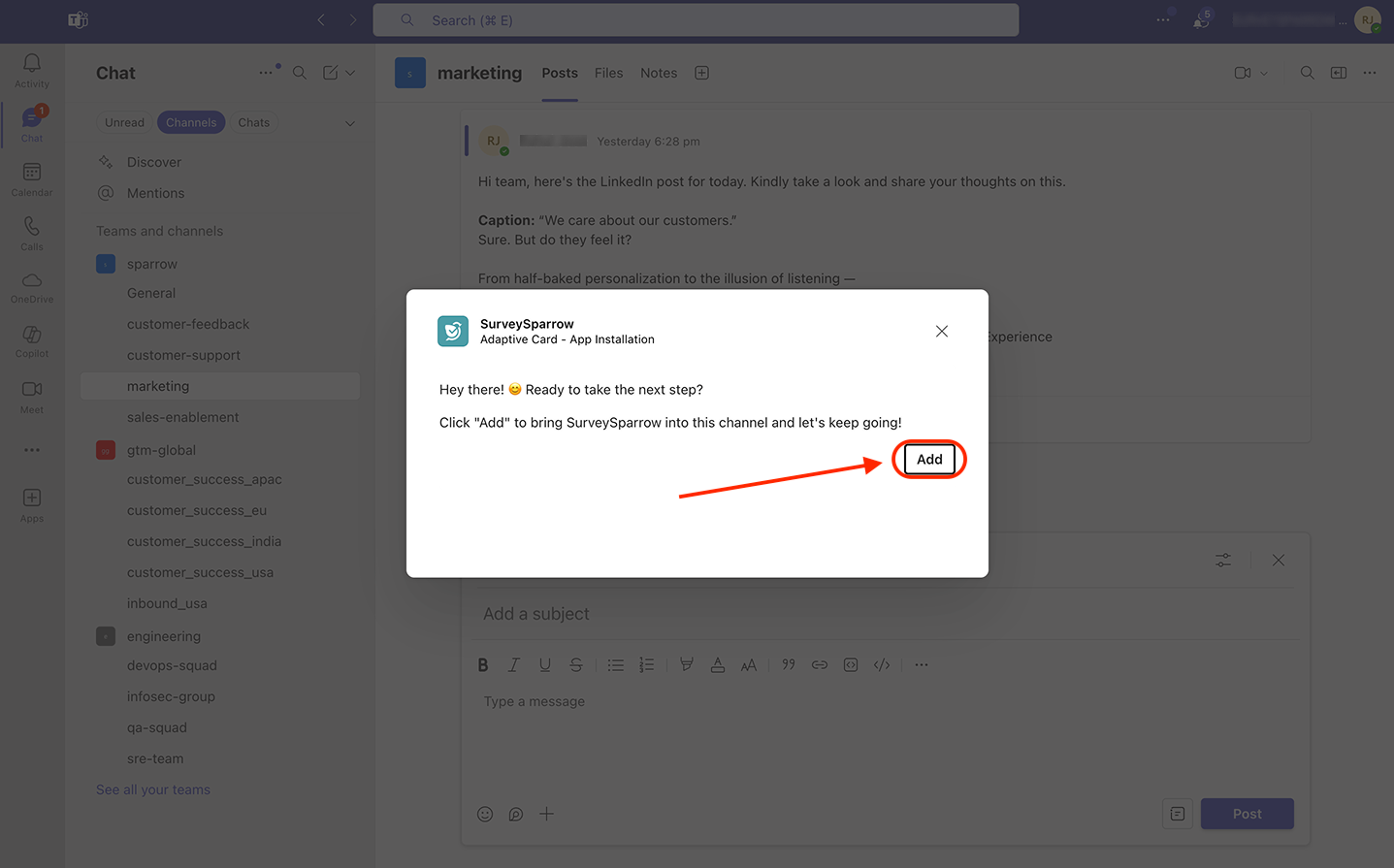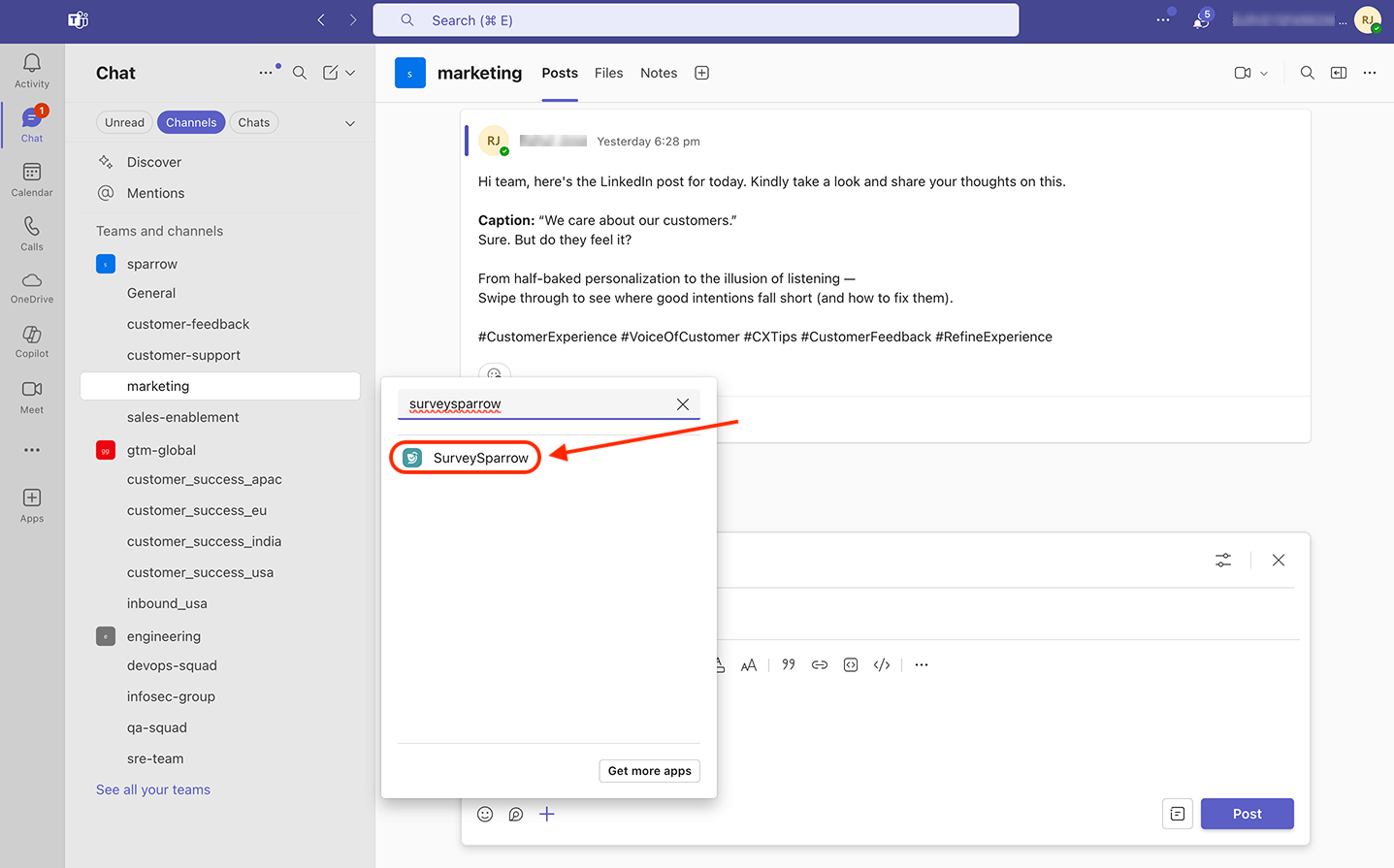 14. If you want to add the SurveySparrow app to another team, start a post in a channel inside the team. Then click on the plus icon in the text box.