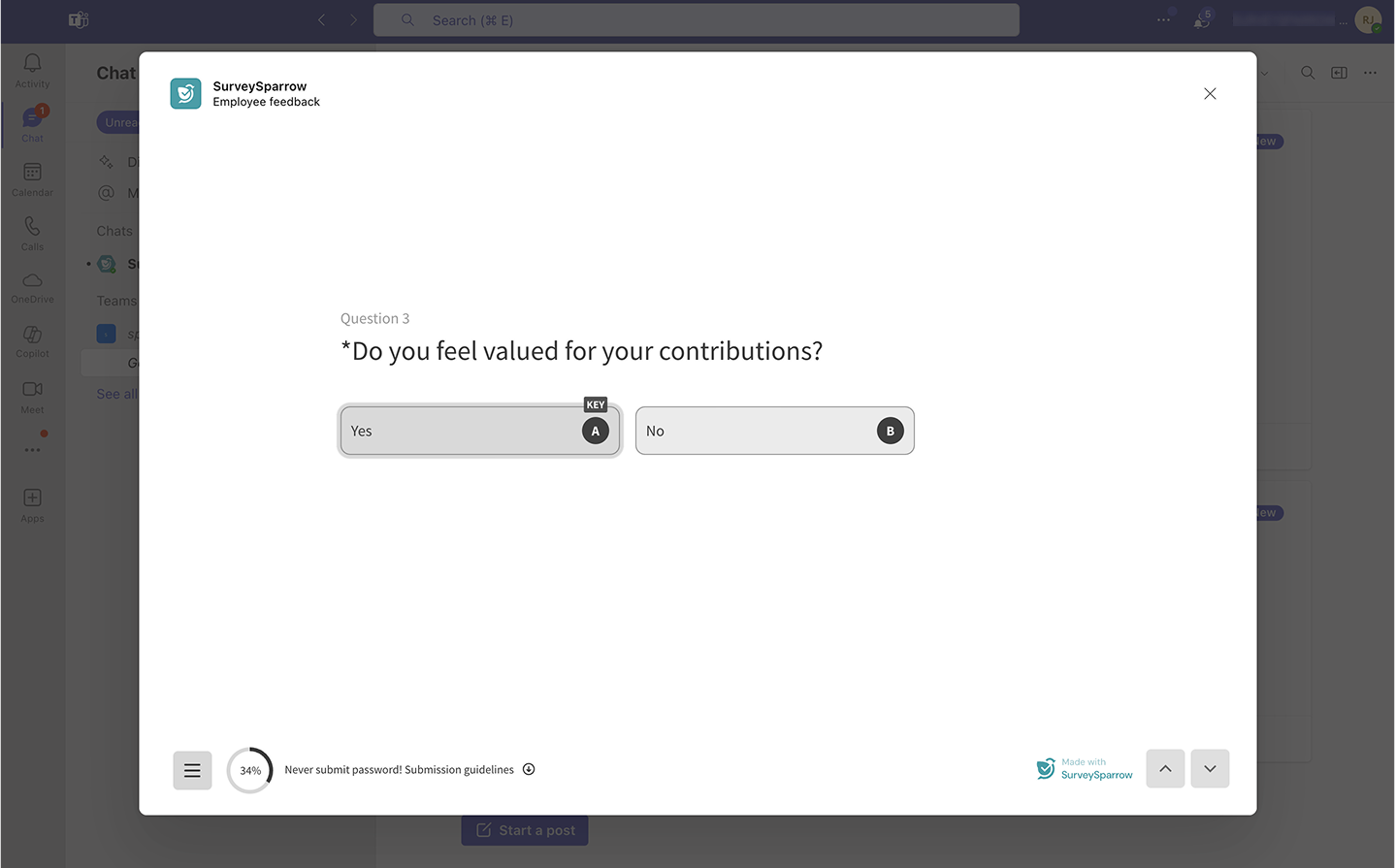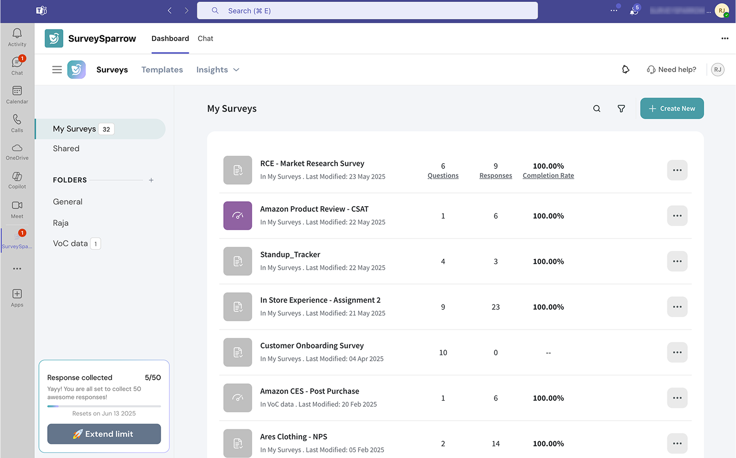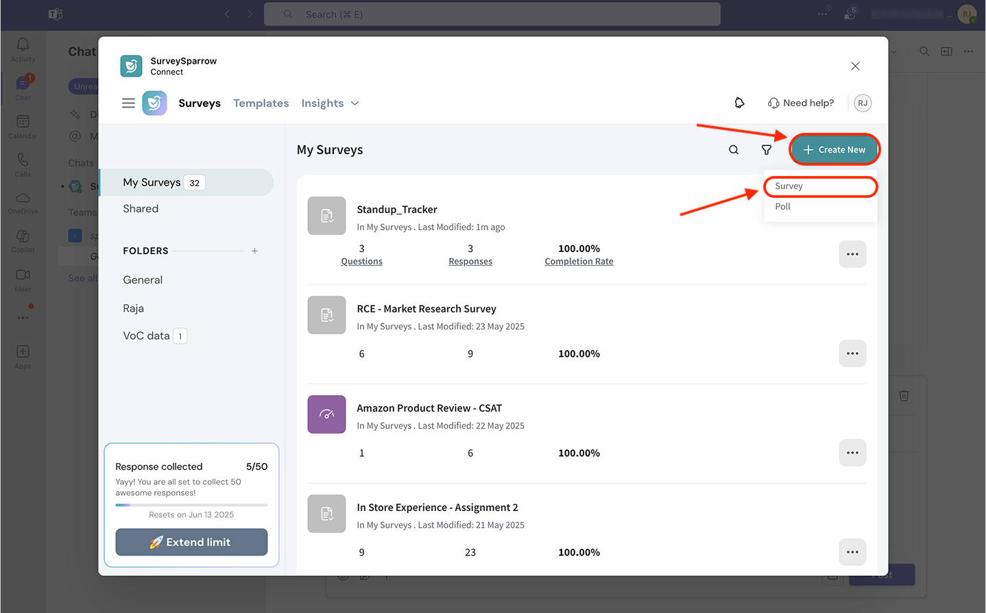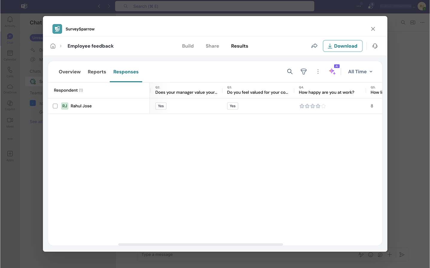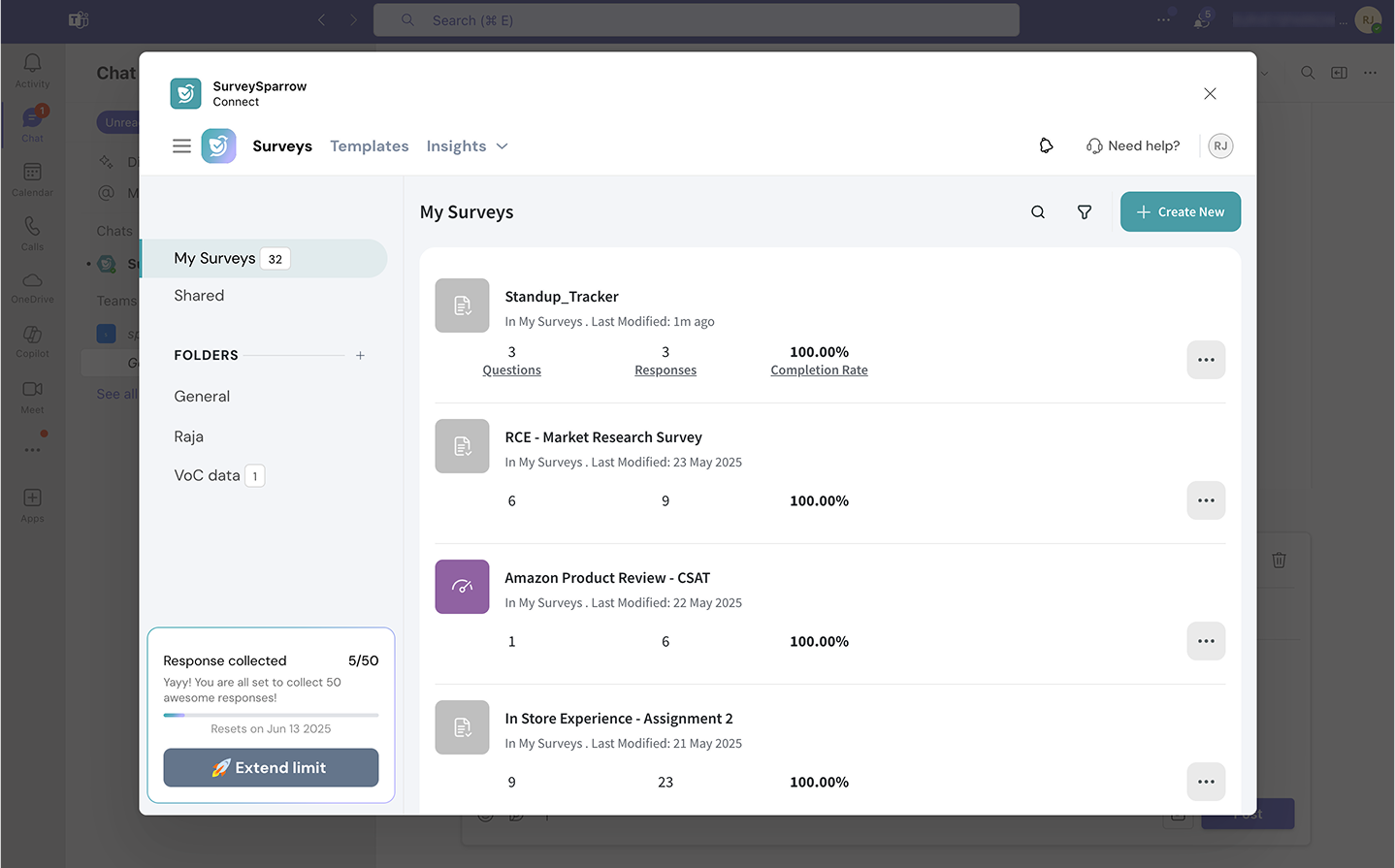 The Microsoft Teams integration with SurveySparrow lets you create and share surveys and polls, track responses and view reports in real-time, without moving an inch from your Teams account. The integration also enables you to collaborate with your team for better productivity.