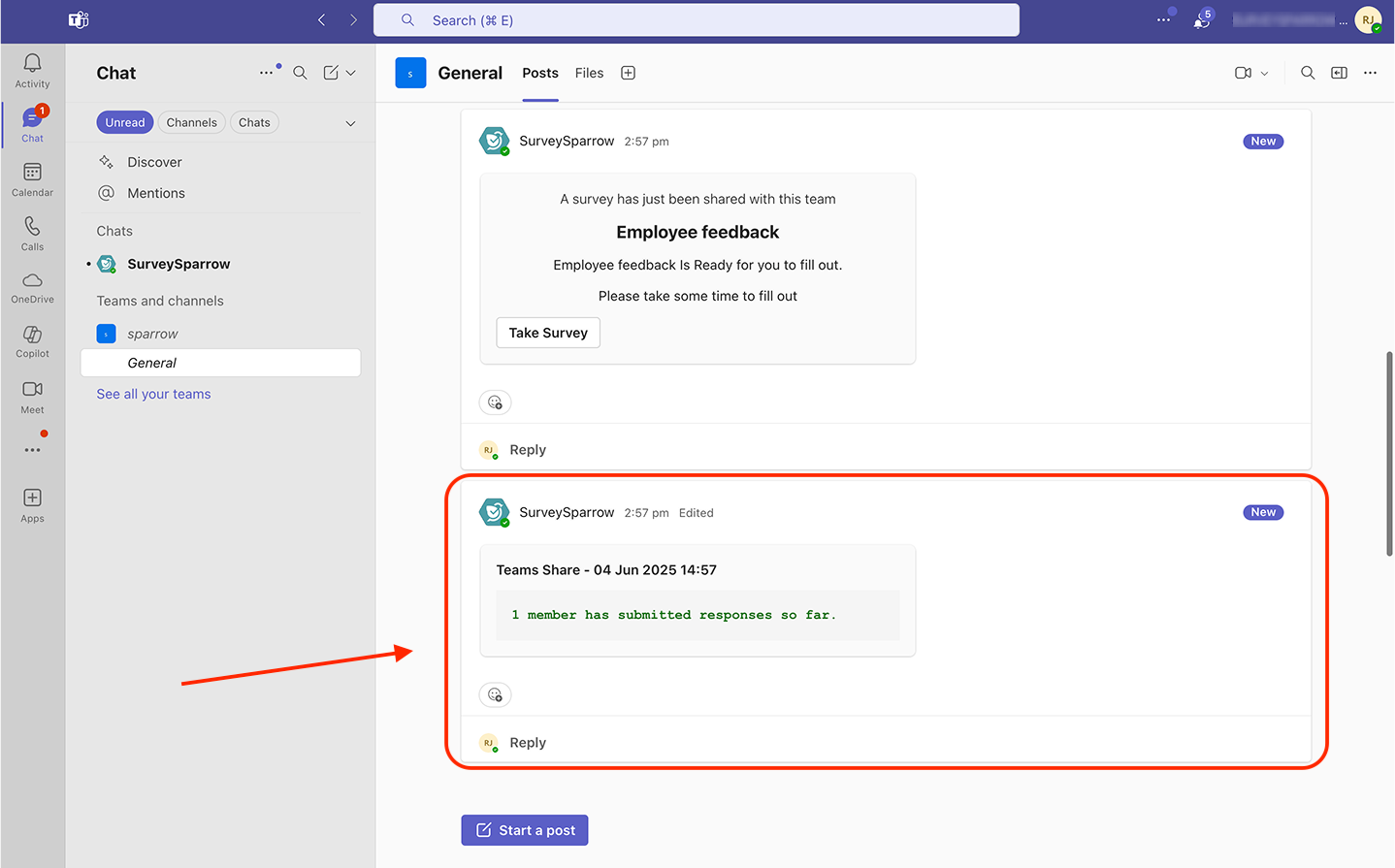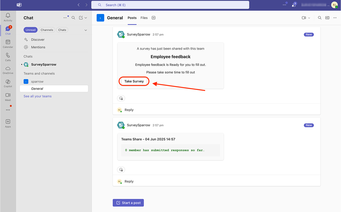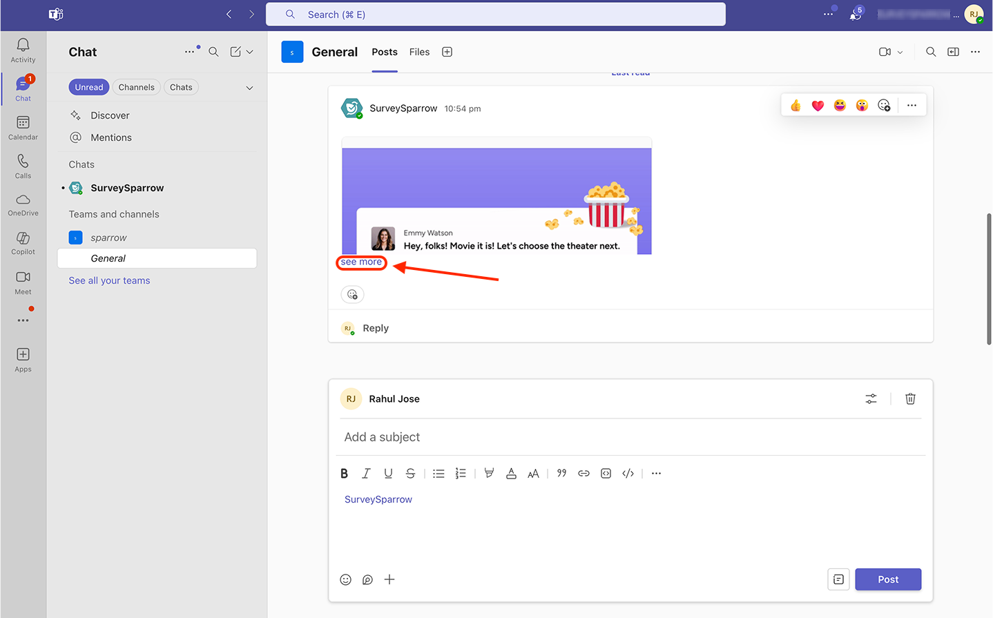 10. You are then taken to the channel/meeting, where you’ll see a message from SurveySparrow. Click see more to expand the message.