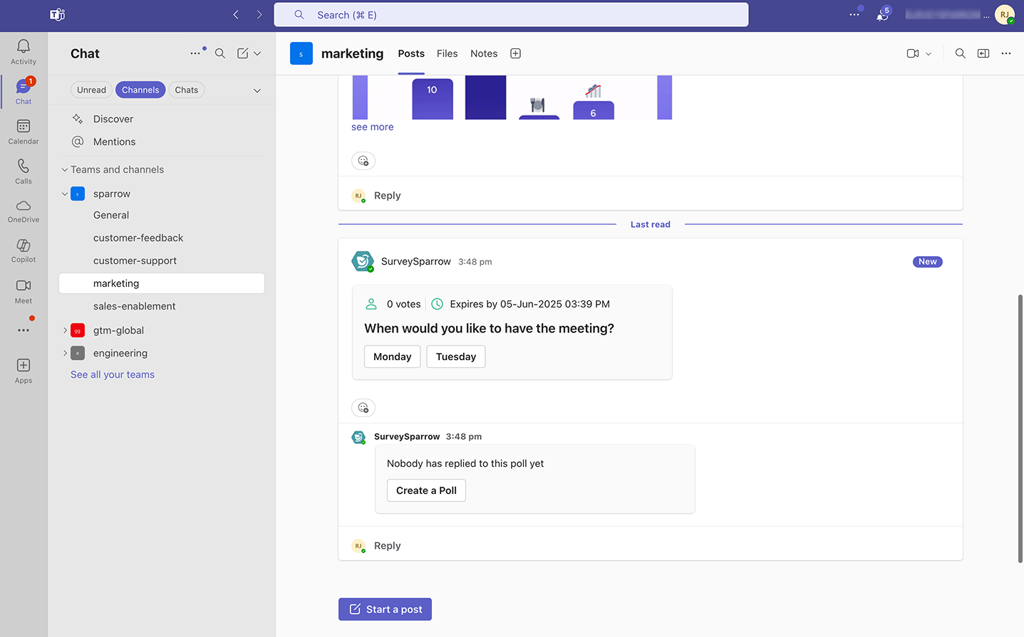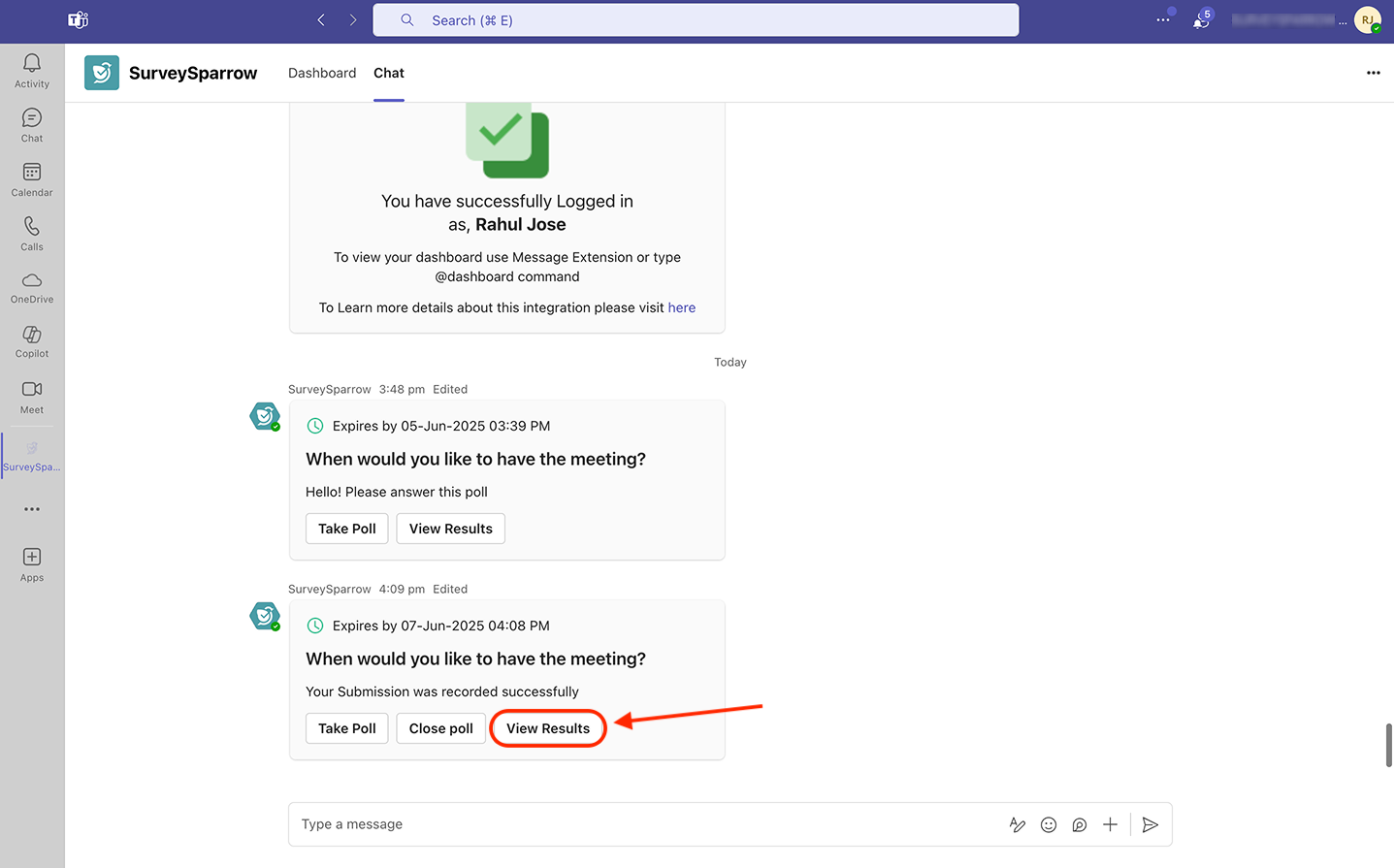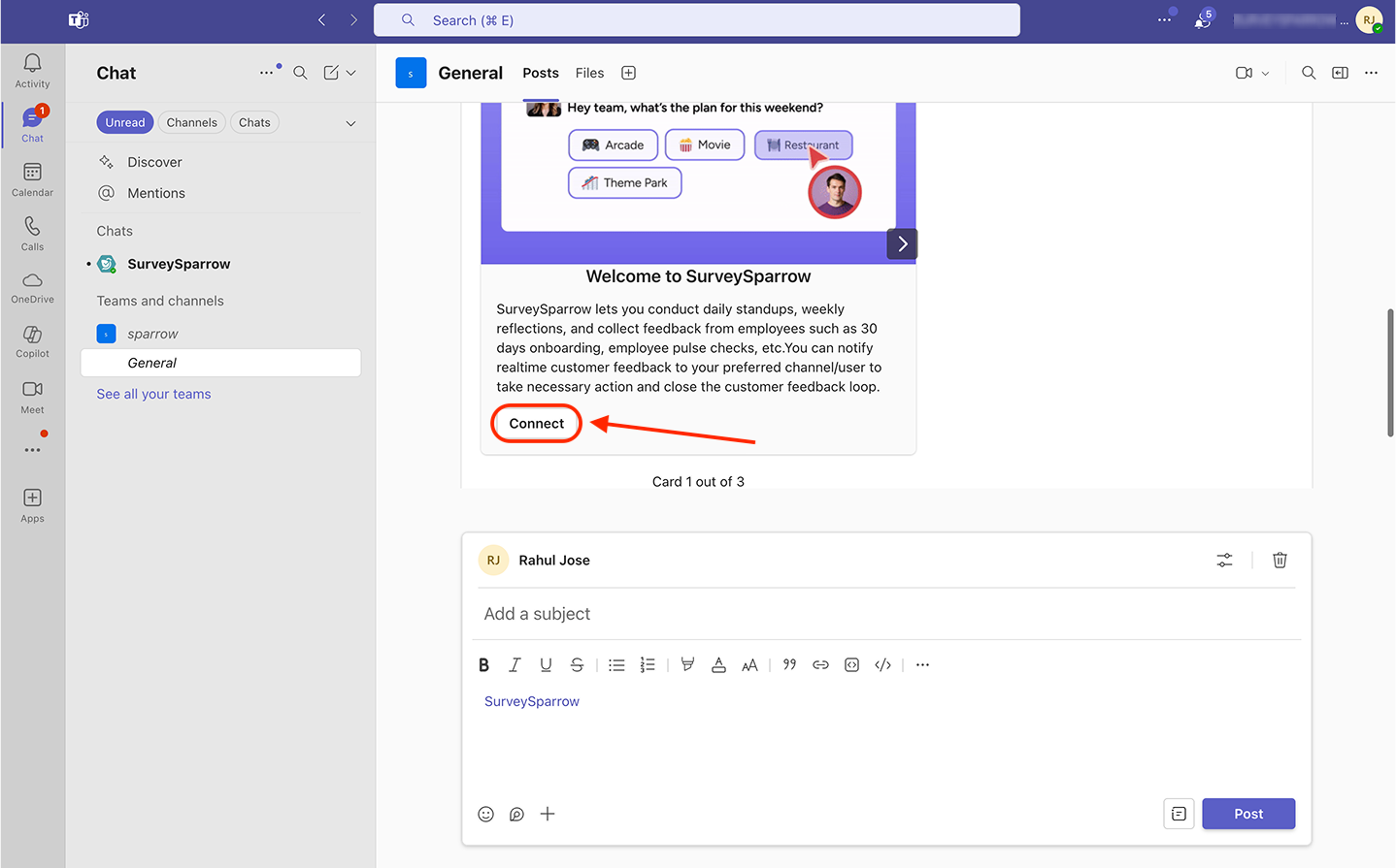 10. You are then taken to the channel/meeting, where you’ll see a message from SurveySparrow. Click see more to expand the message.