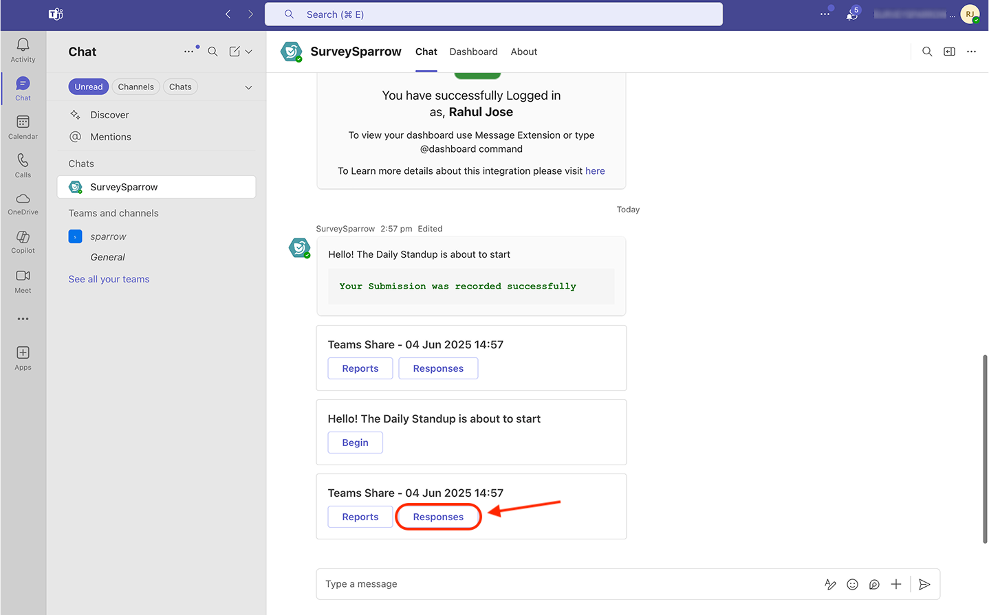 Note: You can also view the responses by directly opening the SurveySparrow app and opening the Chat section. You’ll see result cards corresponding to each survey share you sent. To view the results generated through a share, click on Responses. The SurveySparrow app opens up with the responses section of the survey.
