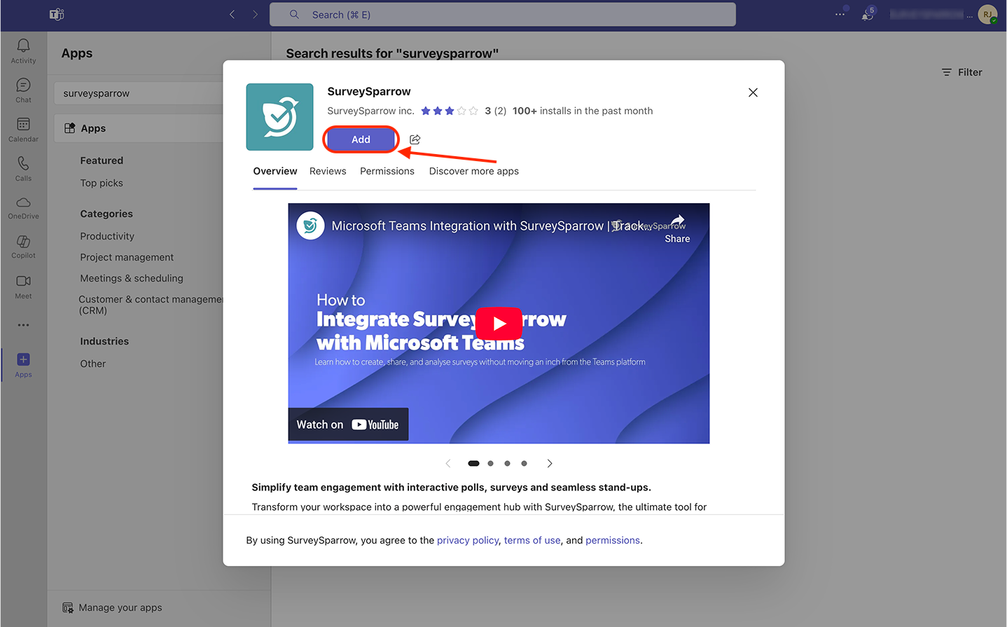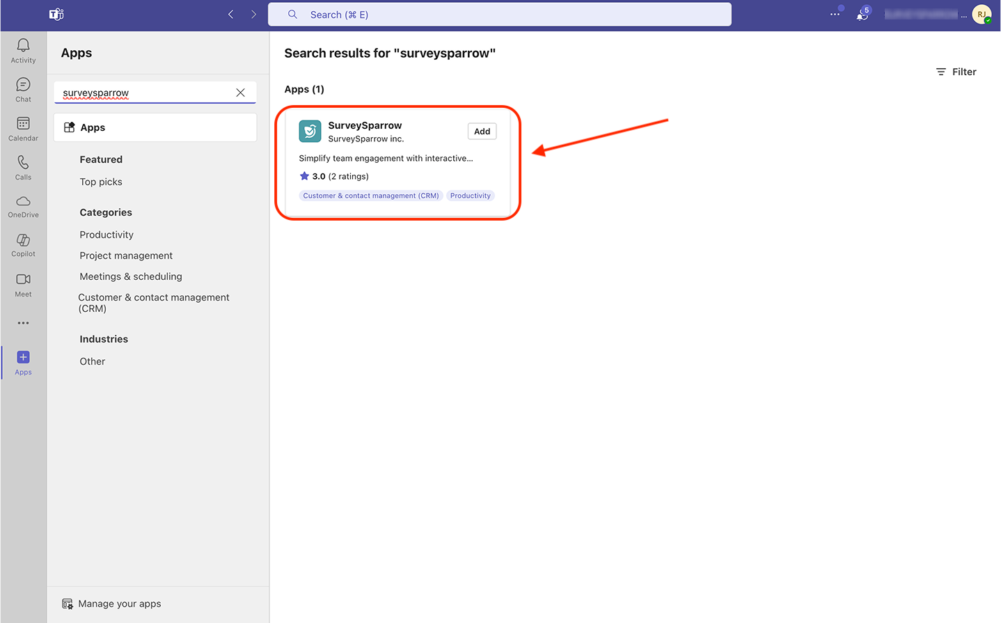Installing the SurveySparrow app inside Microsoft Teams