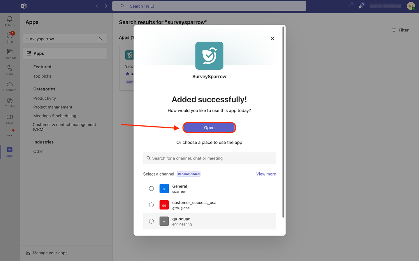 Note: When you add the SurveySparrow app to a channel inside a team, all the other channels of the team will also get instant access.