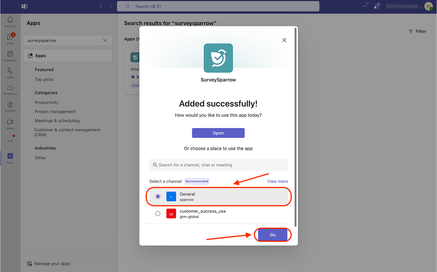 9. However, if you want to instantly use SurveySparrow within a channel, choose from the list (or use the search box) in the post-installation window, then click Go.