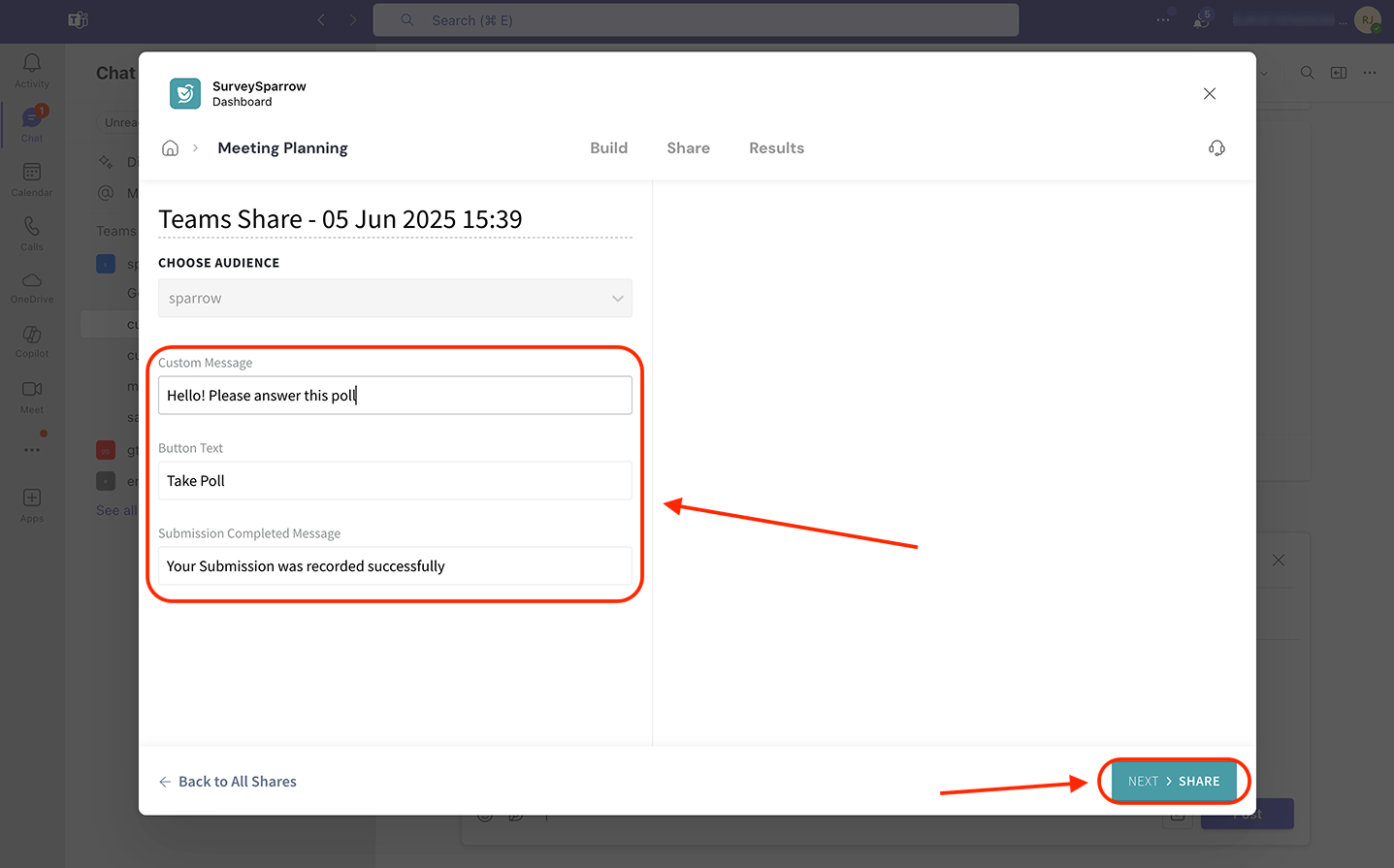 31. Customize the name of the poll share and the content of your poll notification message. After that, click Next > Share to proceed to the scheduling.
