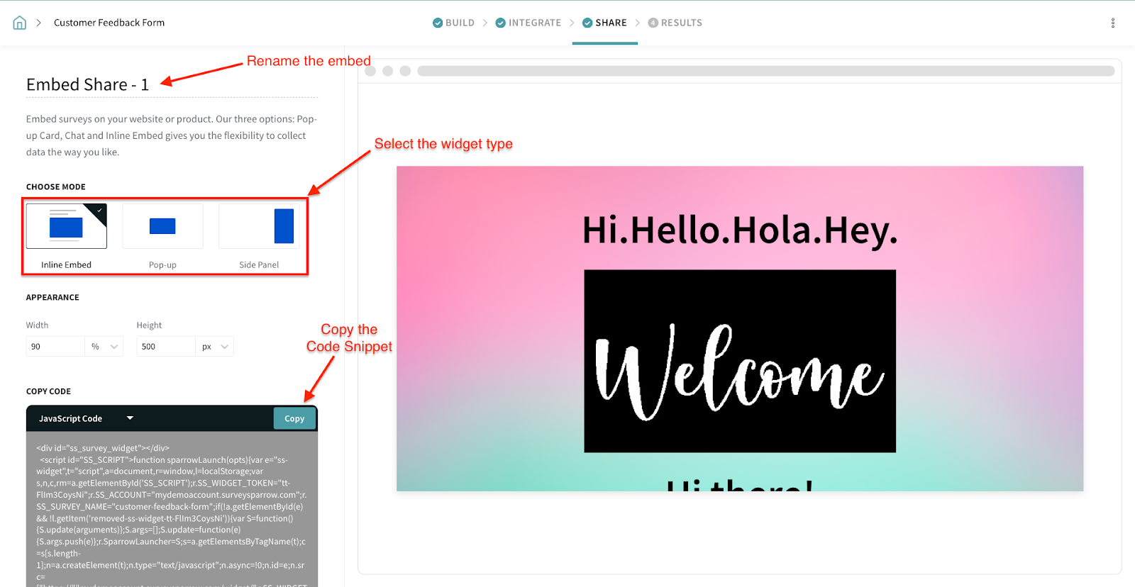 Embedding your survey gives you the option of embedding feedback surveys in website or products. Embedded surveys provide insightful data such as usability, user impressions, and how effective the user found your website. You can also use embeds to collect leads from your website. Embed option in SurveySparrow supports three types of data collection.