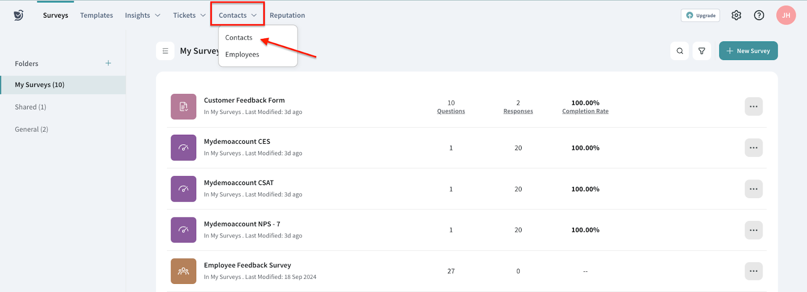 1. Once you login to your SurveySparrow account and land your survey dashboard, click on Contacts at the top as shown in the image below.