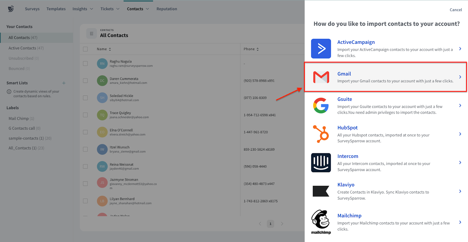 4. Select Gmail from the listed apps to import your Gmail contacts to SurveySparrow account.