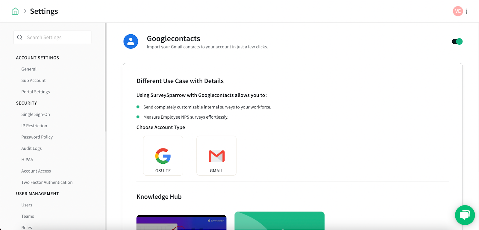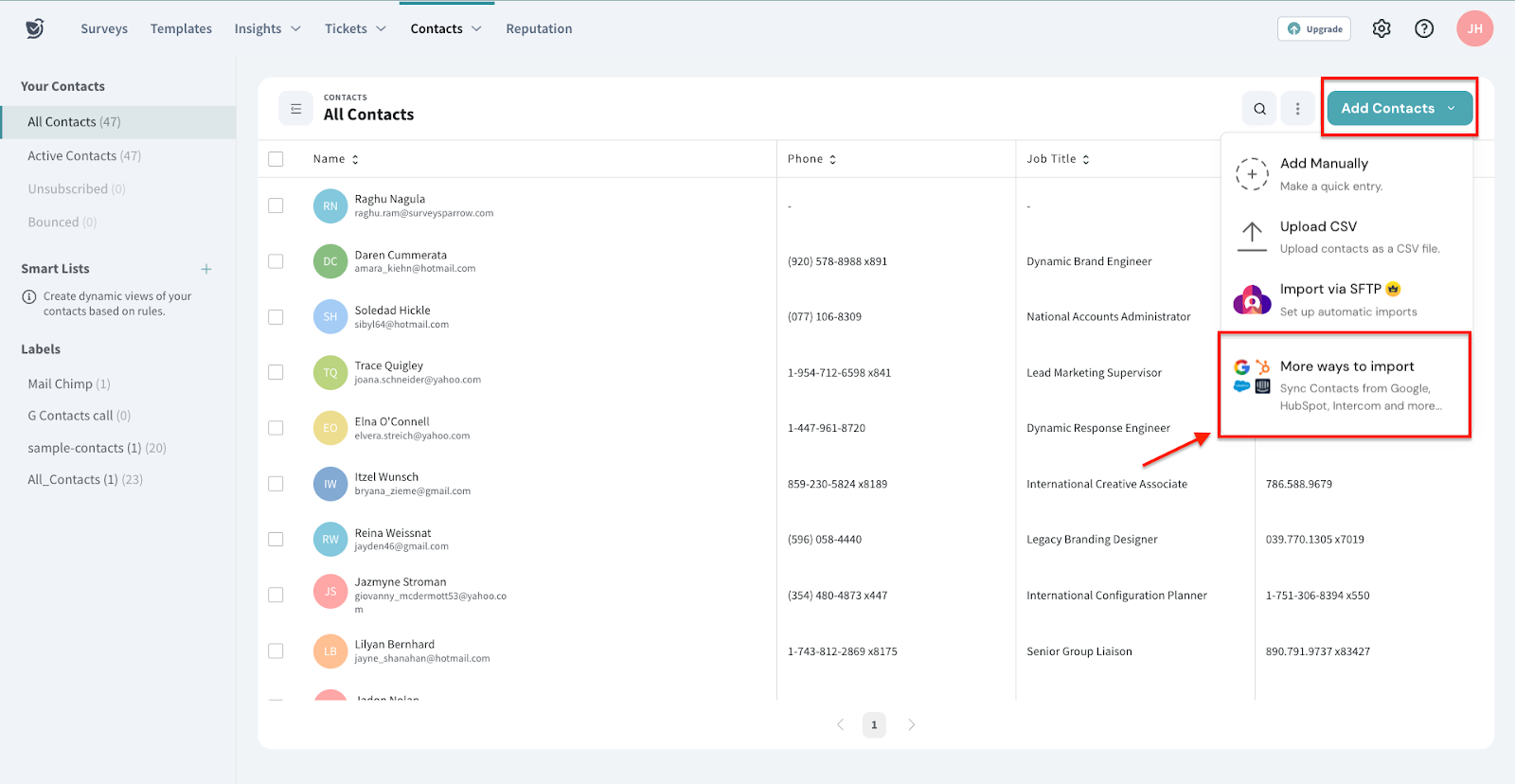 Our brand-new integration with Gmail lets you import your Gmail contacts to your SurveySparrow account, seamlessly. Not just that, you can also update the contact list on a daily, weekly, and monthly basis based on your preferences.