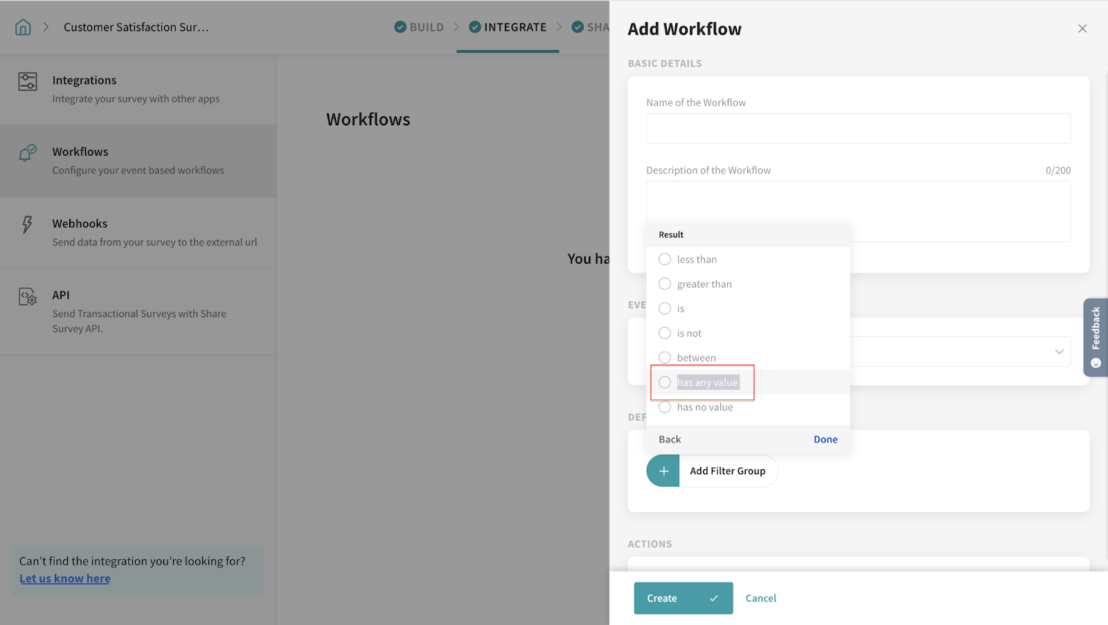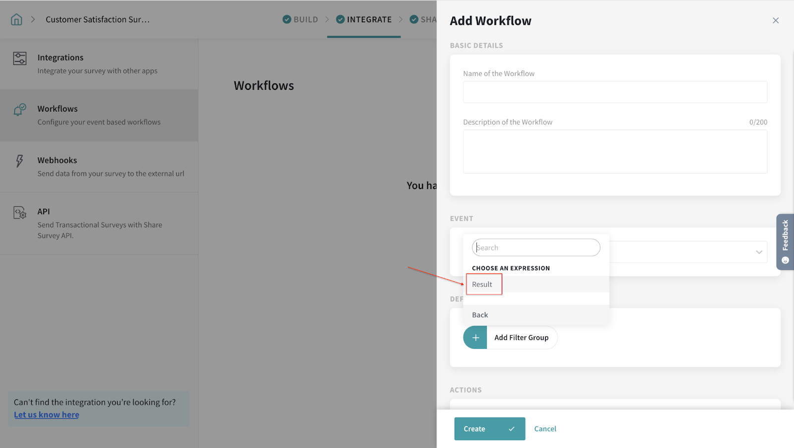2. Click on Add filter group to define the workflow conditions. In our case, we have chosen Expressions since we already have an expression (Result) created for this quiz survey.