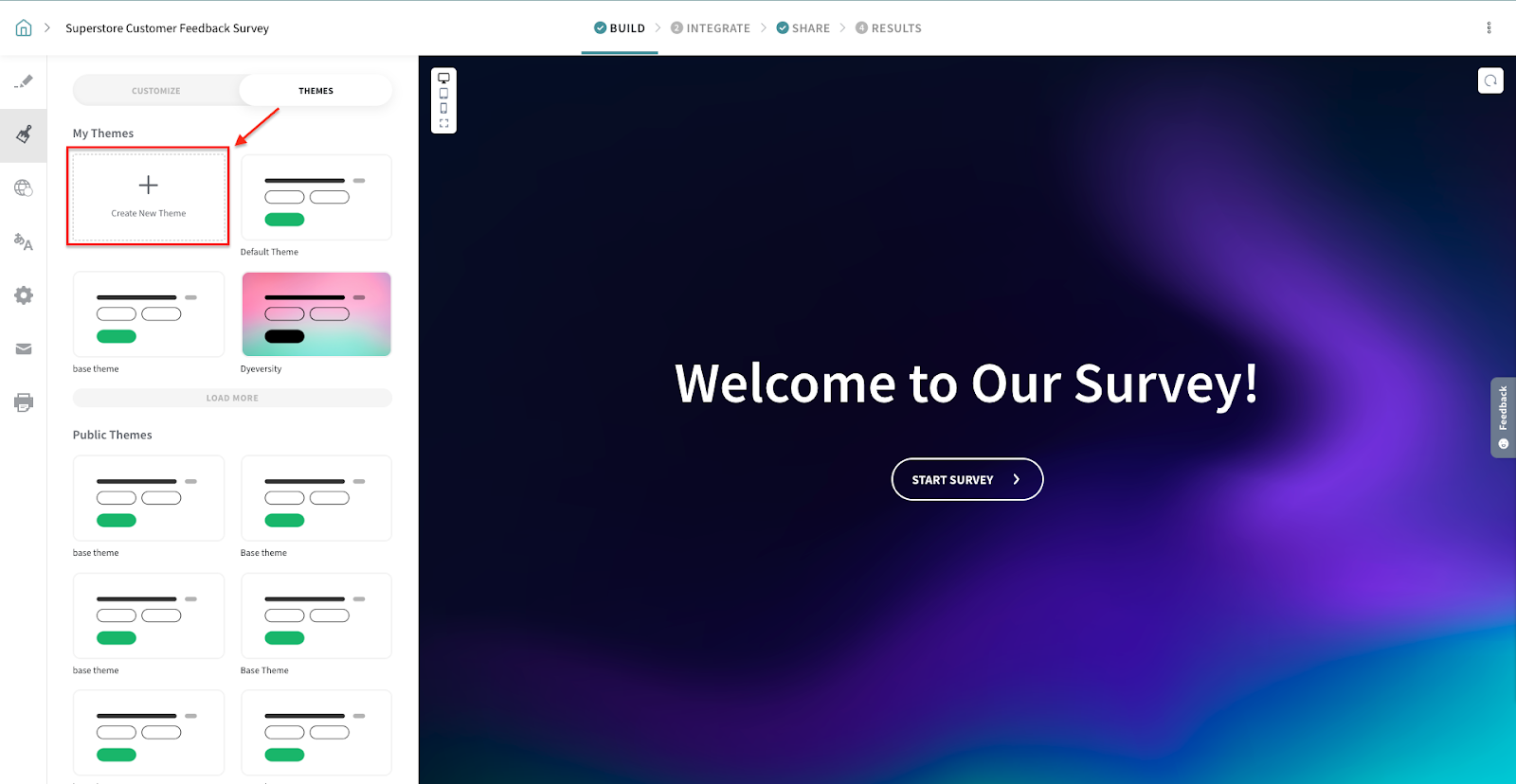 1. On your survey builder interface, navigate to the Design section. Select the ‘Create New Theme’ tile.
