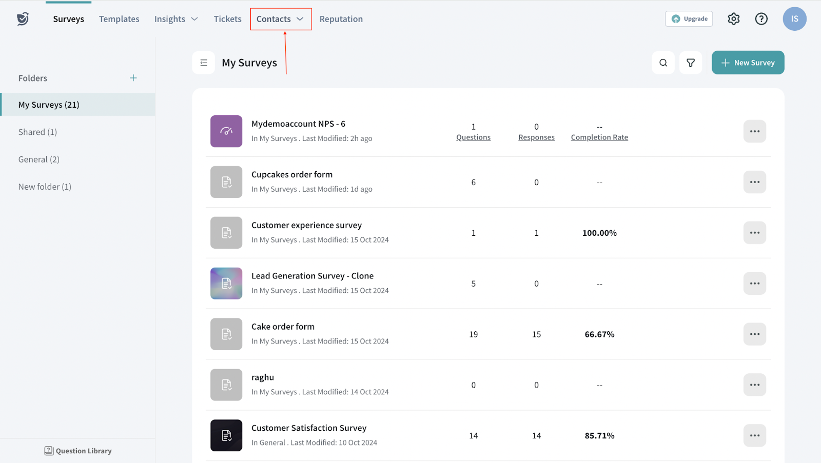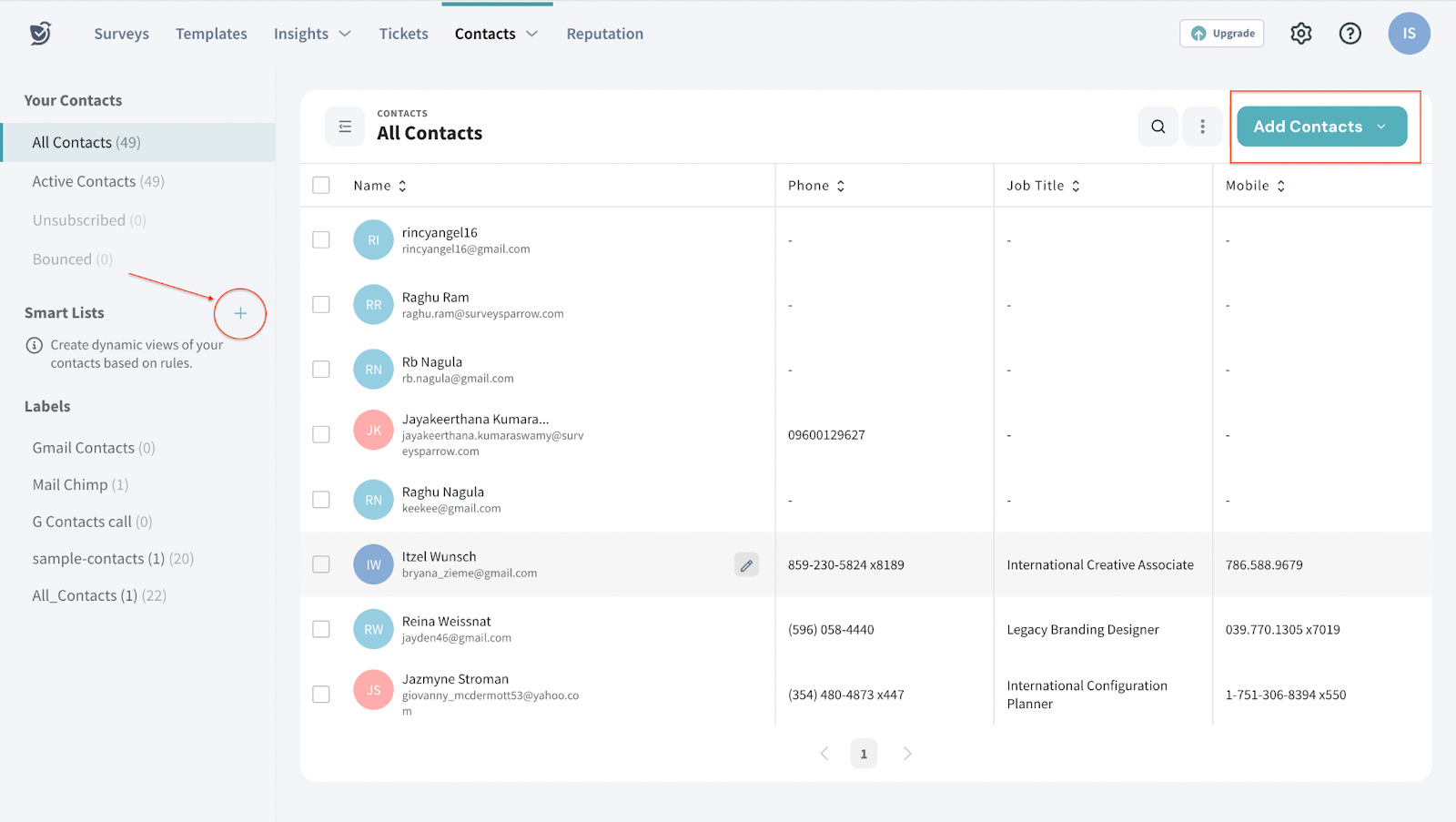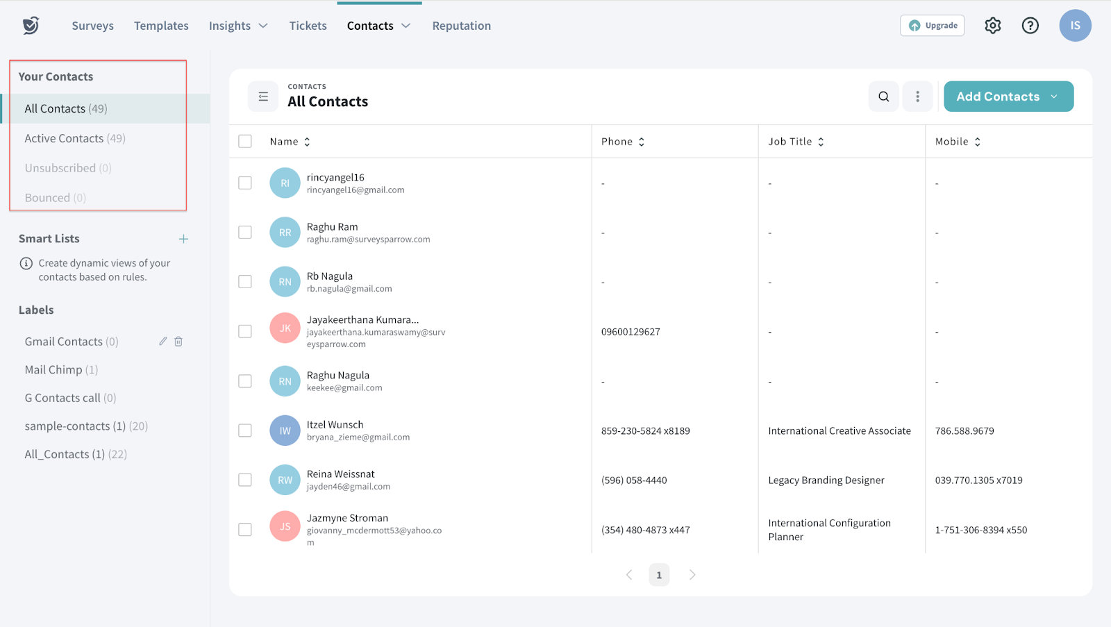 Contacts Management lets you segment your contacts into various custom lists. This is useful if you wish to classify your employees by job titles, or customers by market segment. Segmentation allows you to send a particular survey to a specific list of people. For example, if you wish to send a survey to directors and another one to managers, you can make use of custom lists.