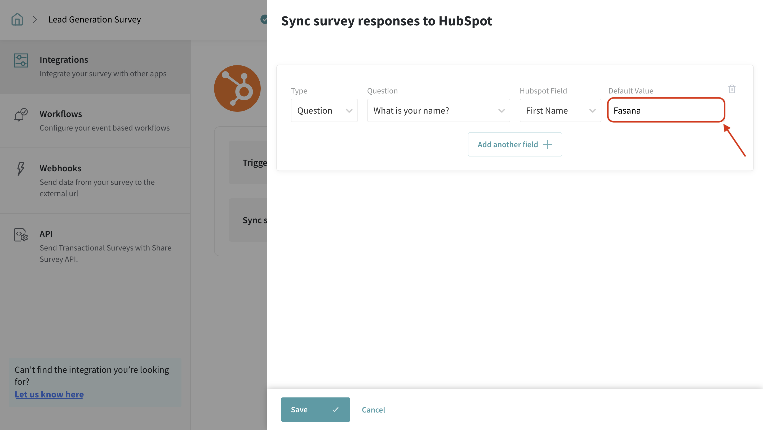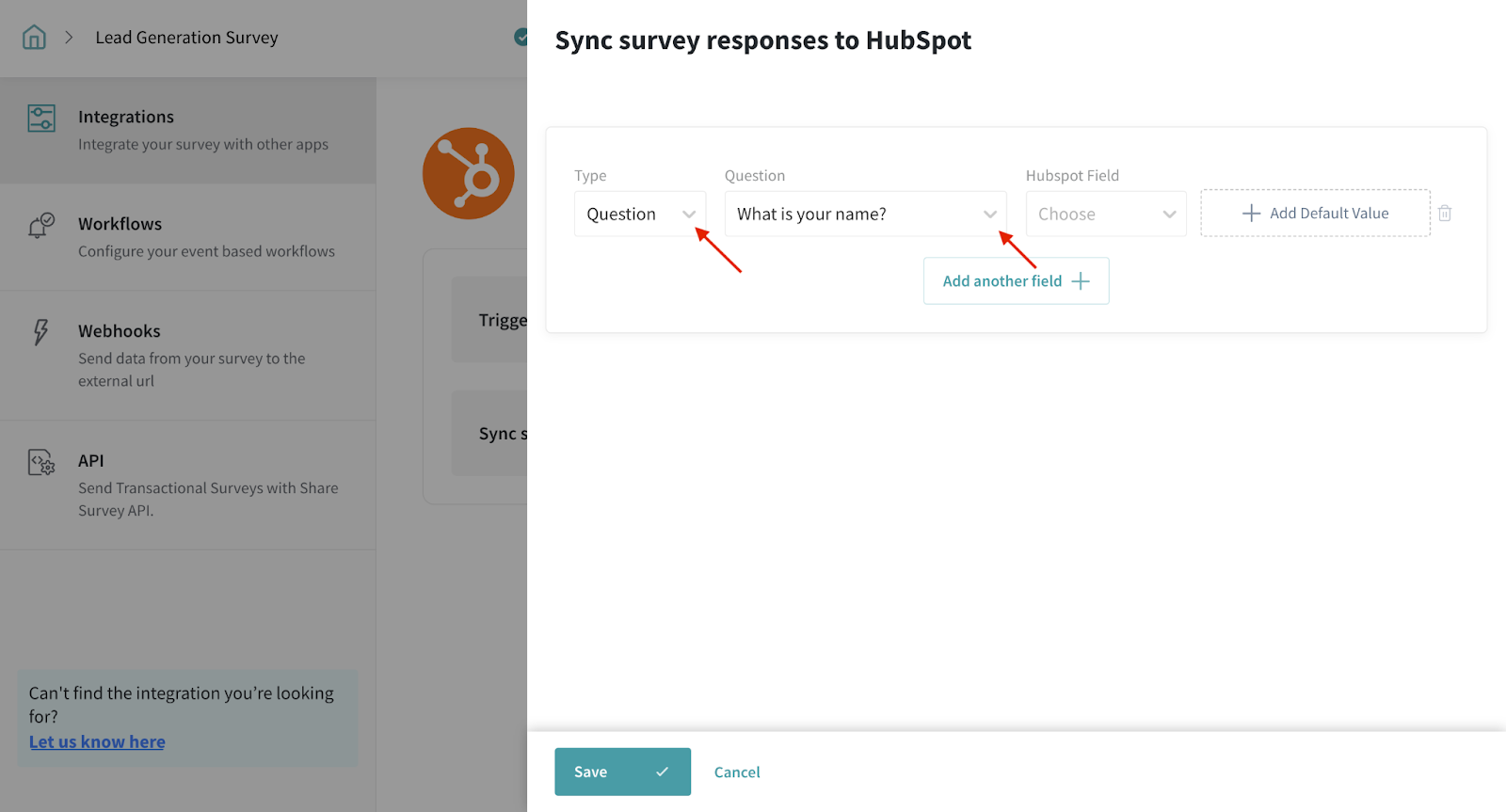 4. Turn on the toggle for Sync survey responses to HubSpot.5. Choose the field type and the corresponding field name.