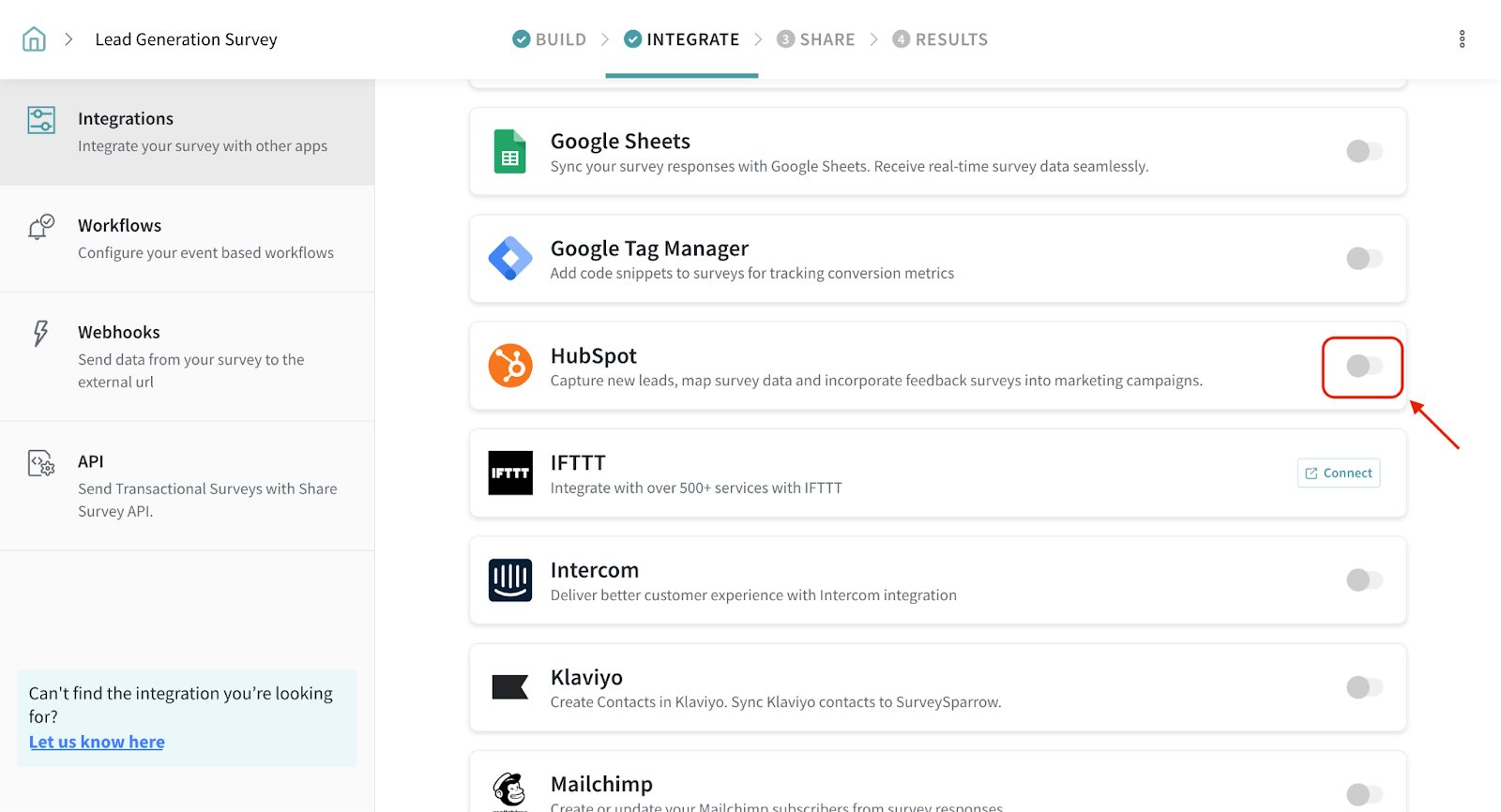3. From the list of integrations, turn on the toggle for HubSpot.