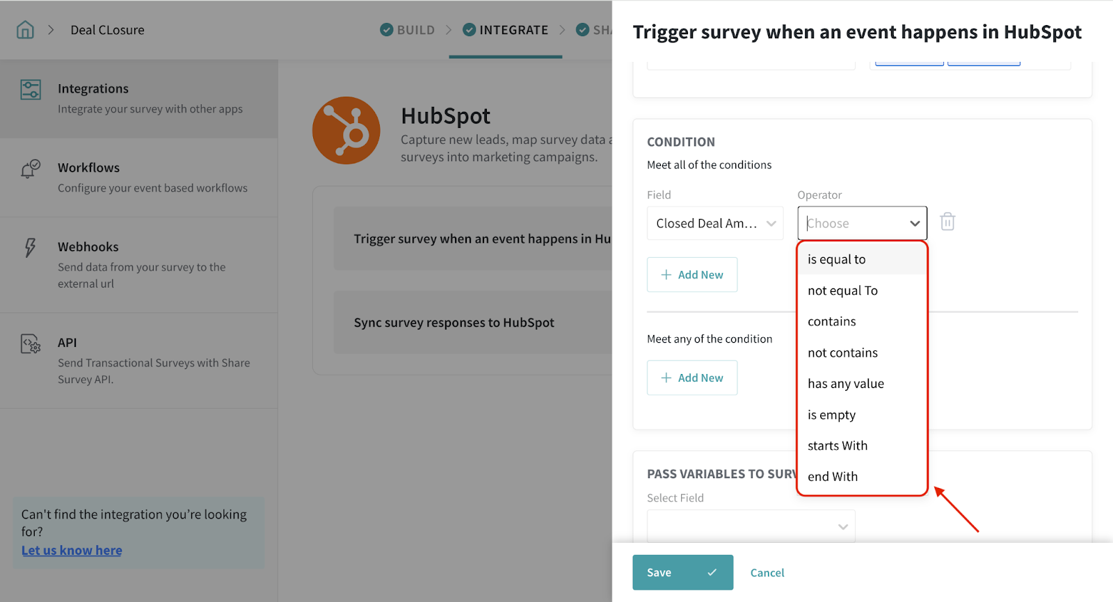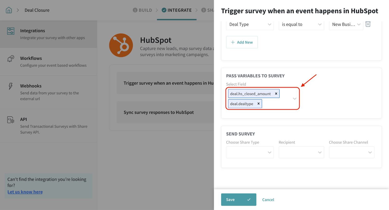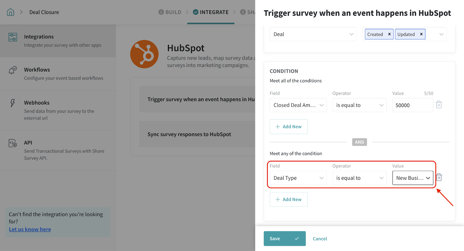 8. Choose from the share type to trigger the survey when an event happens in HubSpot.