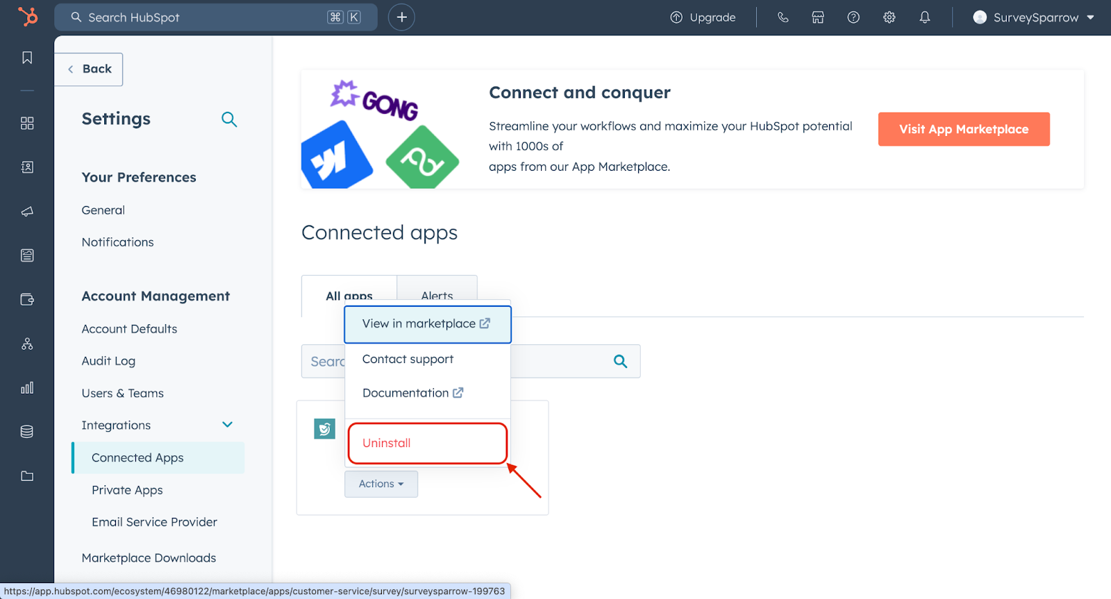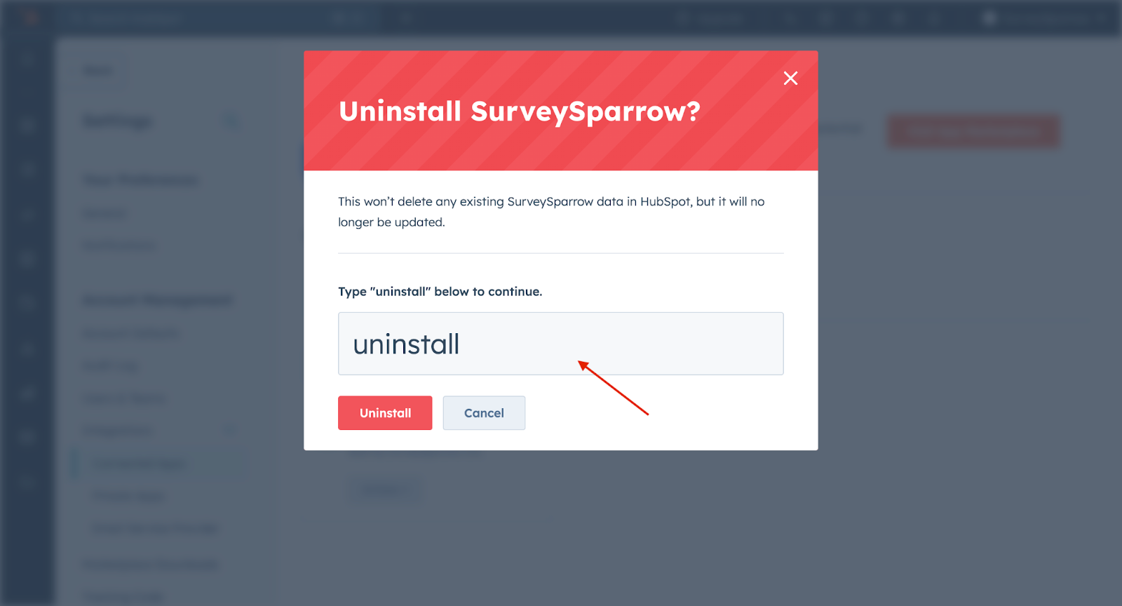 Your SurveySparrow account will now be uninstalled from the HubSpot integration.