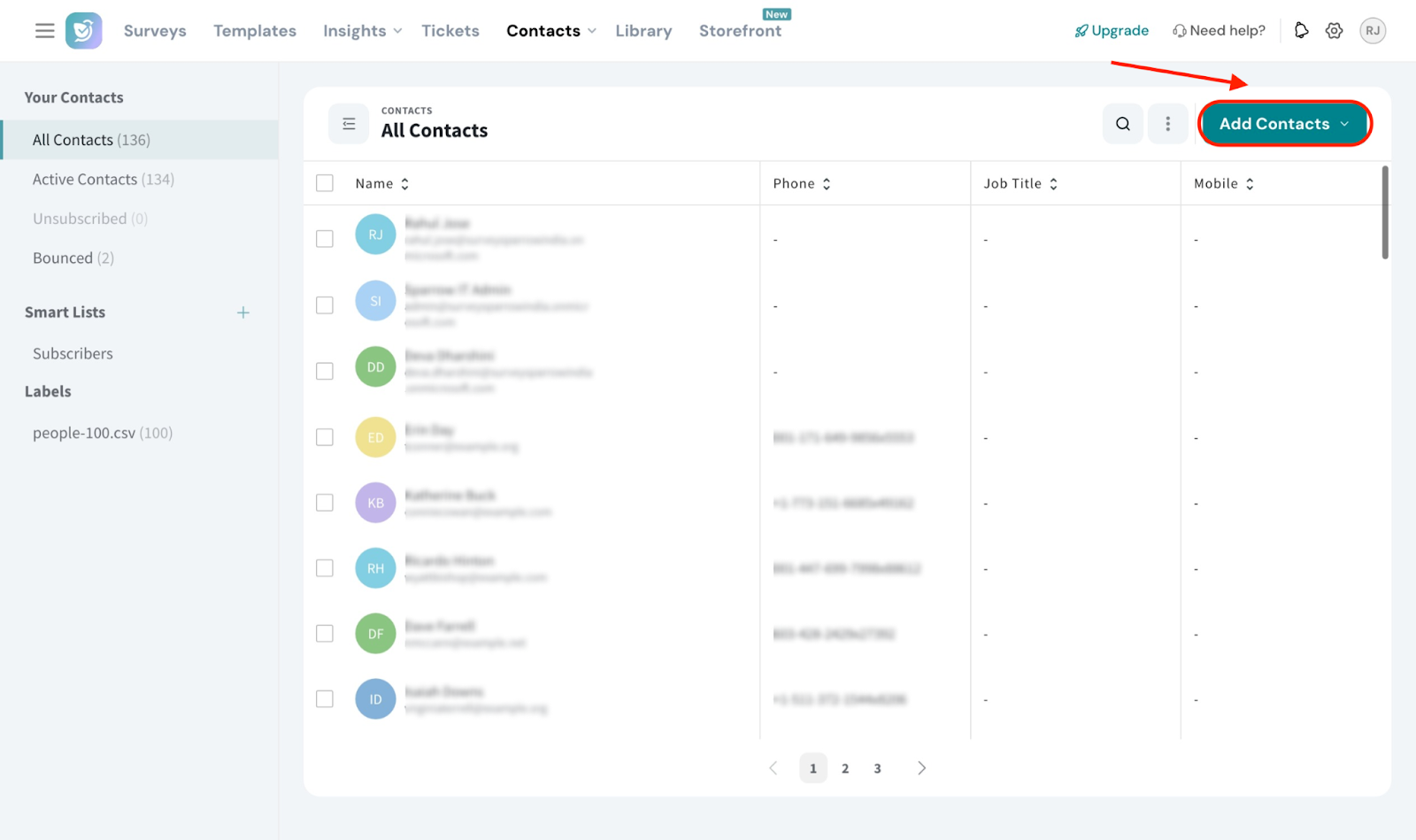 1. Inside your SurveySparrow account, click on Contacts in the top menu bar, then click Contacts from the menu.