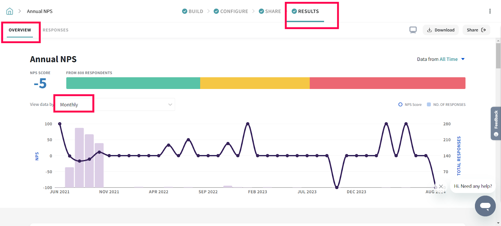 1. In the Results section of your survey, under Overview, you’ll see a trend of NPS responses over time. You can adjust the trend to show responses daily, weekly, monthly, yearly, or on a 30 day rolling average.