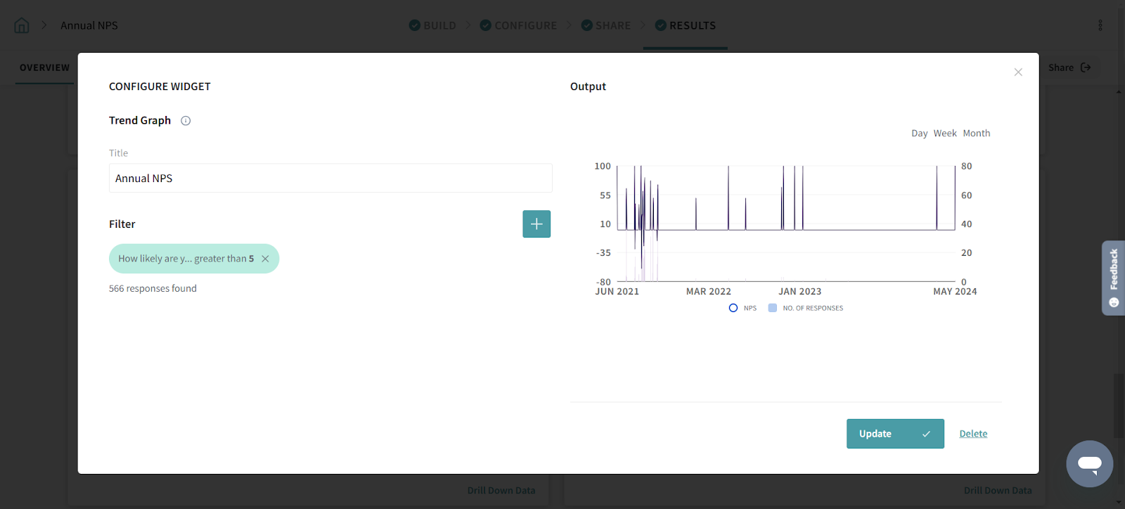 The Trend Graph widget shows you a trend of NPS responses over time and lets you apply a set of rules and conditions to slice through your data.