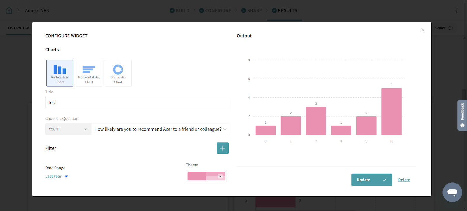 The vertical bar chart lets you represent your NPS data in a vertical format. You can see the number of the respondents and NPS scores using vertical bars.