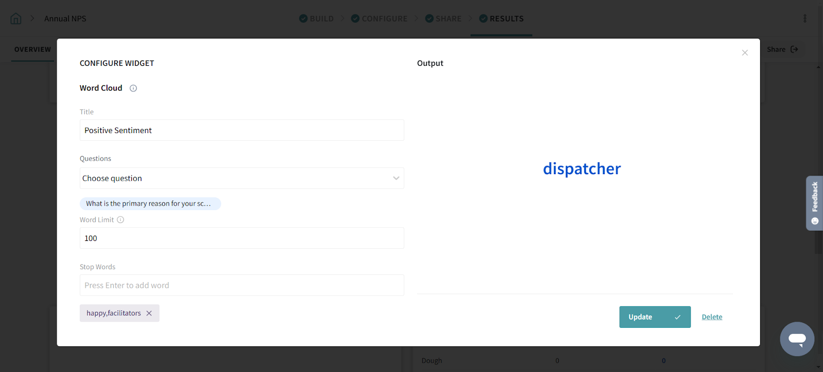The Word Cloud widget lets you identify and view the most commonly used words in NPS responses. The word cloud is a cluster of words with the size of the words indicating how often the word appears in your collected responses.