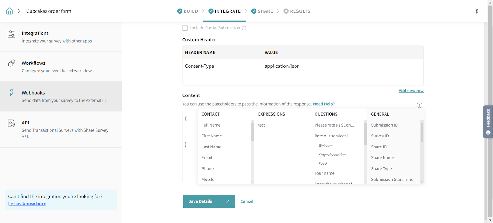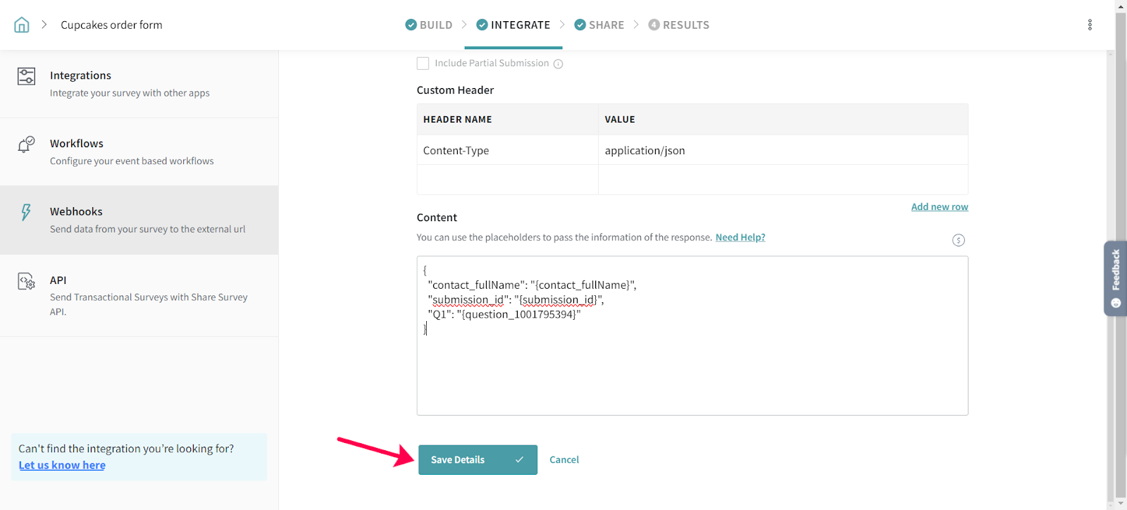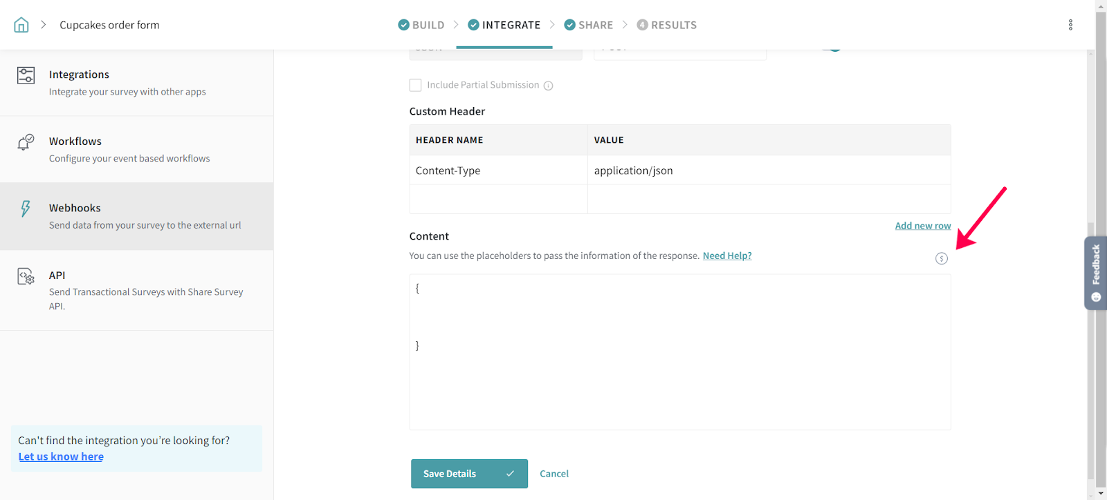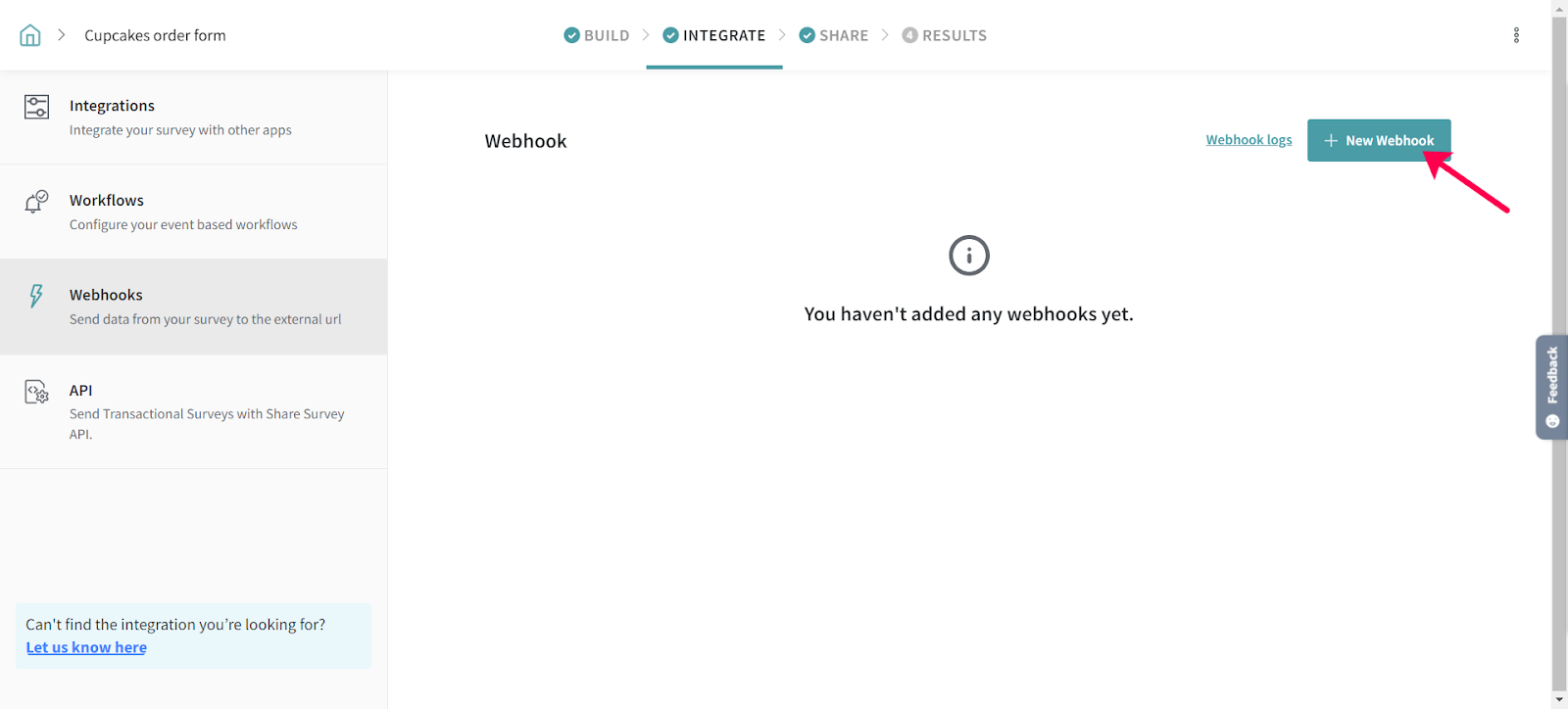 2. The Survey Integration page opens, click on Webhooks tab.