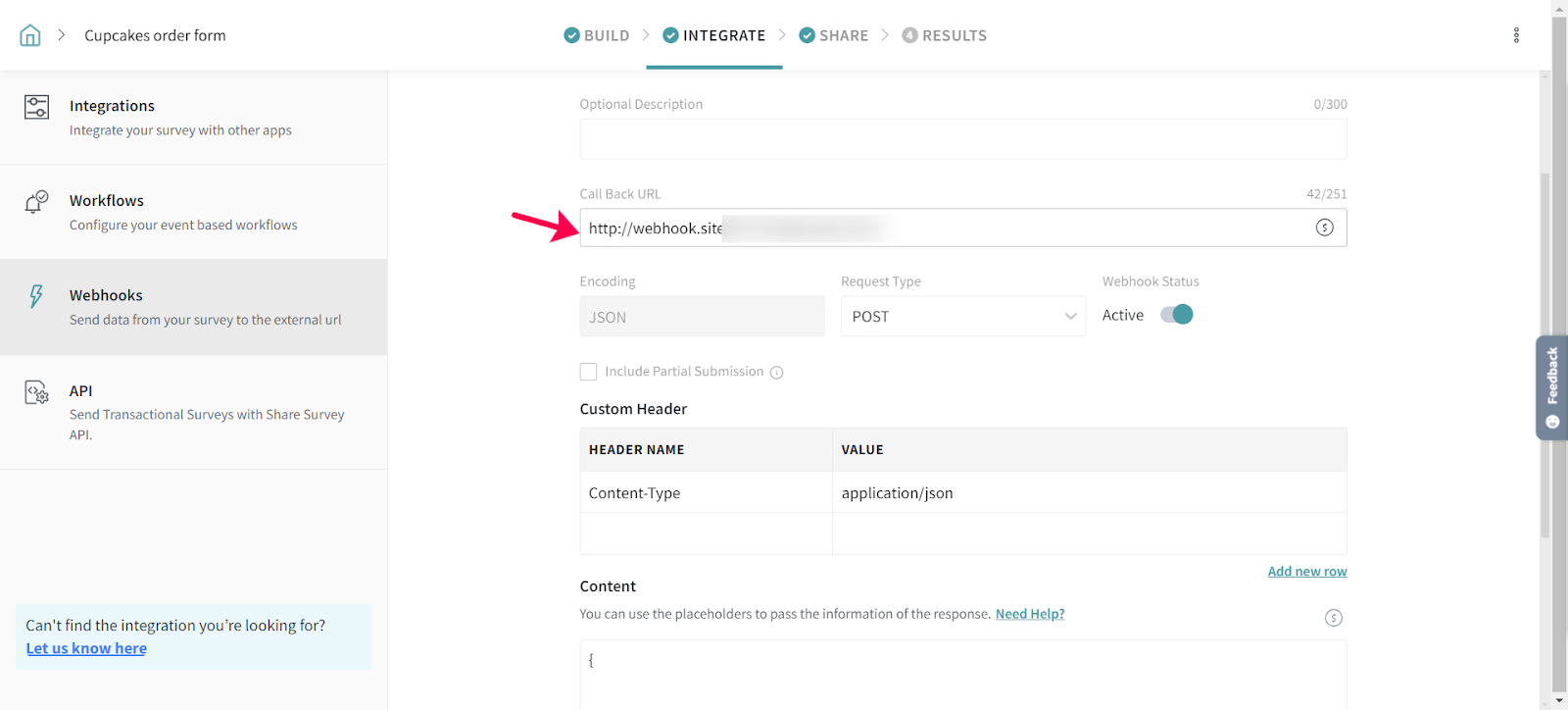 4. On the Webhooks page, you will find all the configurations required to set up your Webhook. Enter your Webhook URL under the ‘Call Back URL’ field. The survey data is sent to this URL.