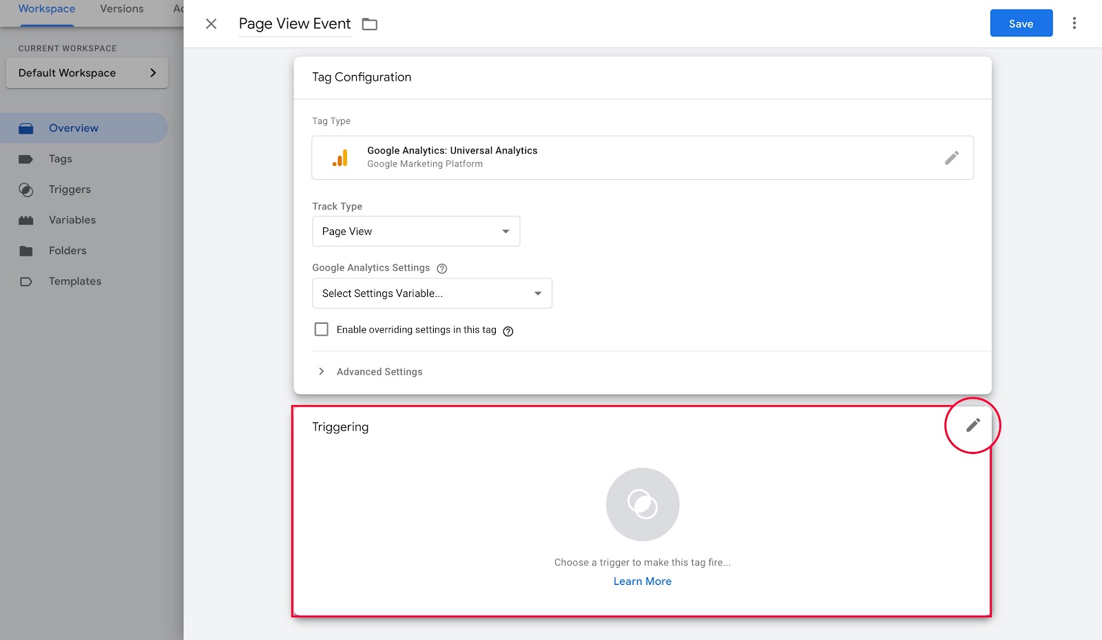 4. Next, create a trigger by clicking on the Triggering section under the Tag configuration.