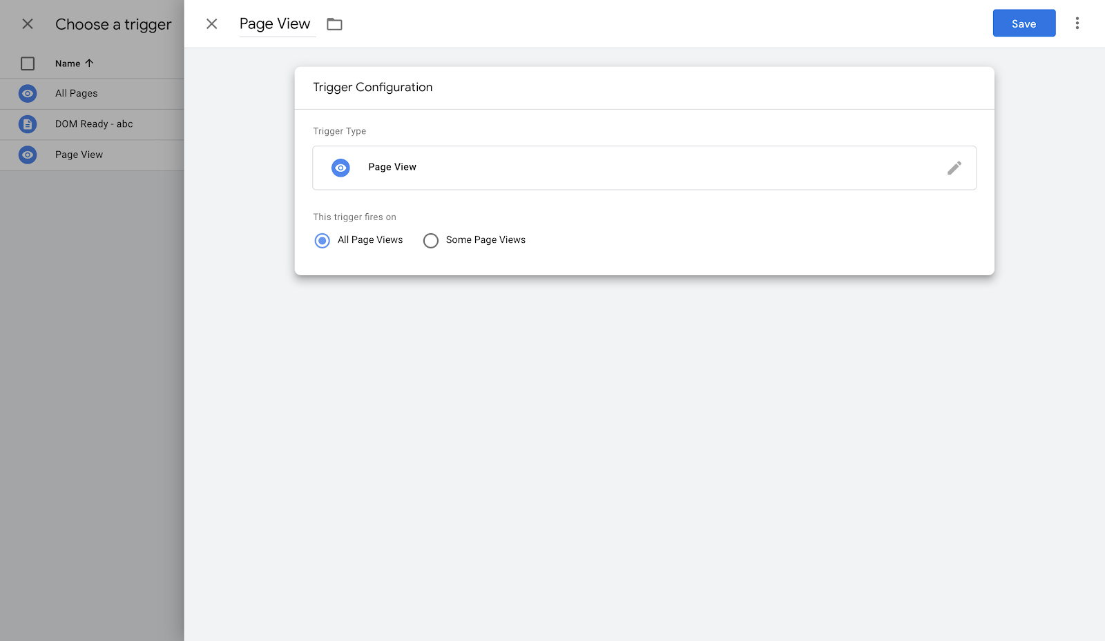 5. Create a trigger by clicking on the Triggering section under the Tag configuration. Choose the Page View trigger, so whenever the page is viewed for the first time, the above script will run.