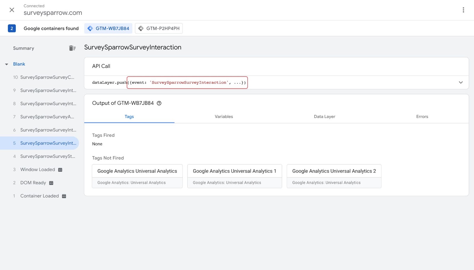 5. As you start answering the survey questions, various events will be added to the Tag Assistant Page. Some of the actions that GTM tracks in default are when a survey is started, answered, skipped, or submitted. These events were pushed from the SurveySparrow survey to the GTM data layer.