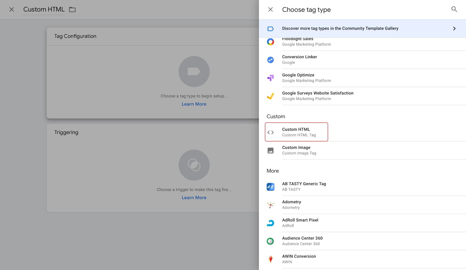 3. In the Tag Configuration section, Select Custom HTML.