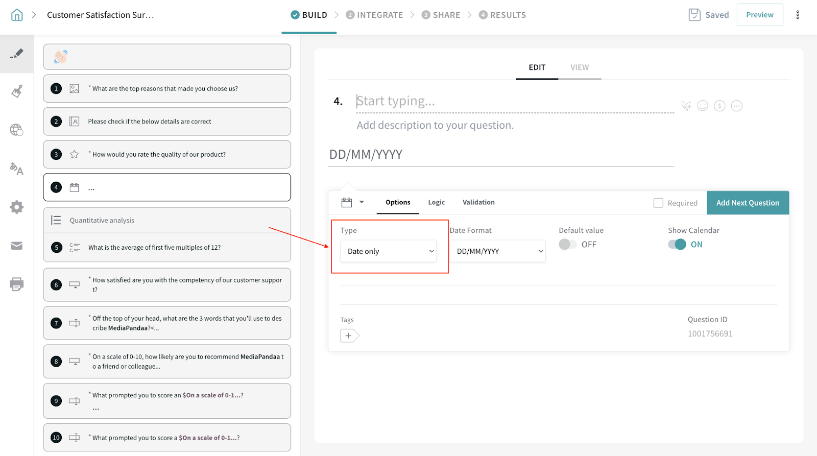 1. To create a question that asks for a date as the response, click on the “+” button and choose the “Date” question type.