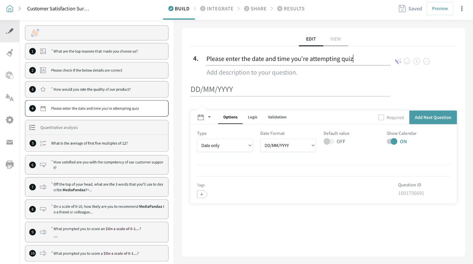 The date question type allows you to preset the date format in your surveys. With this feature, all your respondents will be made to enter the date in a specific format - either DD/MM/YYYY, MM/DD/YYYY, or YYYY/MM/DD, making it uniform.