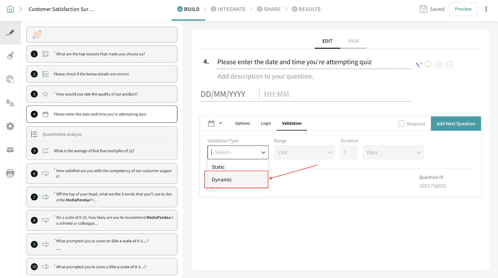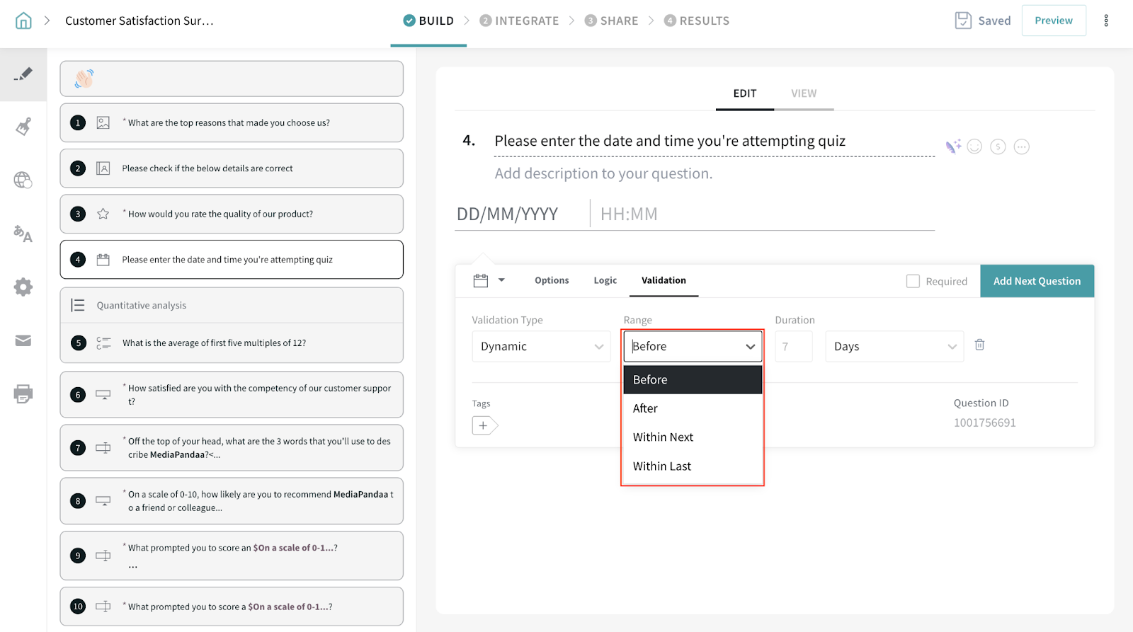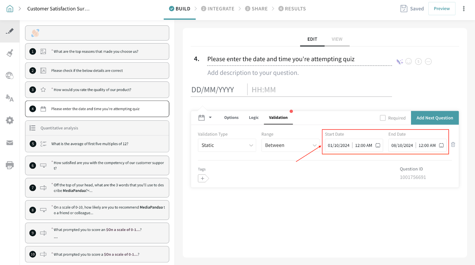 - While setting a date range for validation, both the start date and the end date will be included for the respondent to choose.