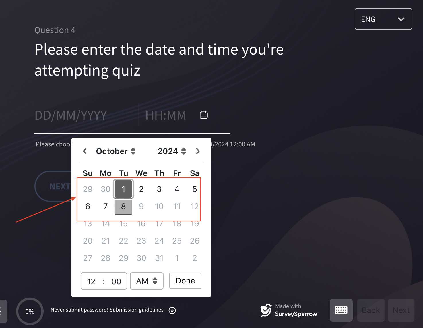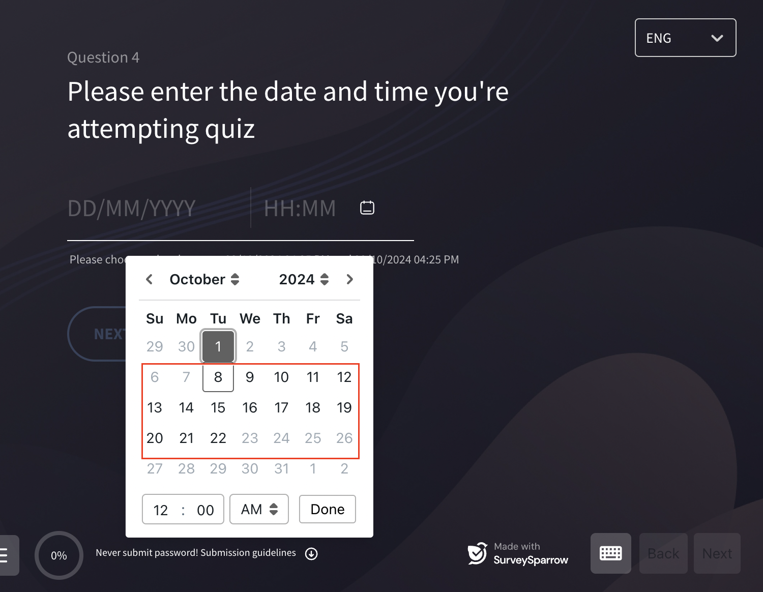 Now, when the respondent fills the form, they will be able to choose a date from the active dates based on the validation set relative to the date on which they fill the form.