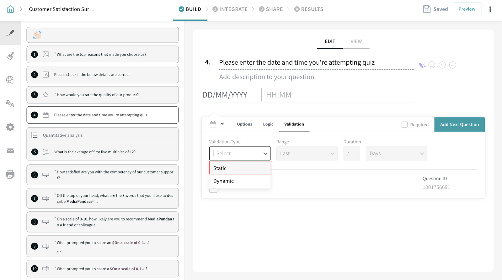 With the static date range validation, the active dates that the respondent can choose from will be fixed when you set the validations and create a survey. The active dates that the respondents can choose will remain the same irrespective of when they fill out the survey.
