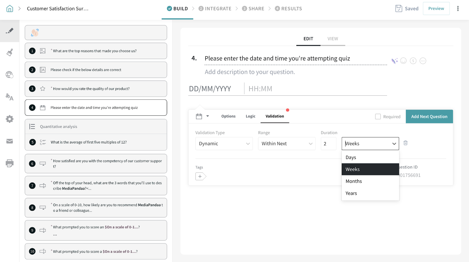 4. Enter the Duration within which the active dates have to be shown to the respondent. To select a date within the next two months, enter “2” in the Duration box and choose “Weeks” from the drop-down.