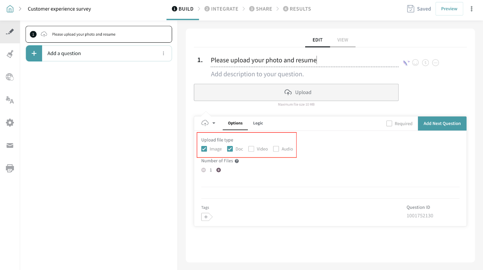 2. Within the question, you will find 4 file type option that’s highlighted below. Tick the ones you want your respondents to upload. You must choose at least one type.