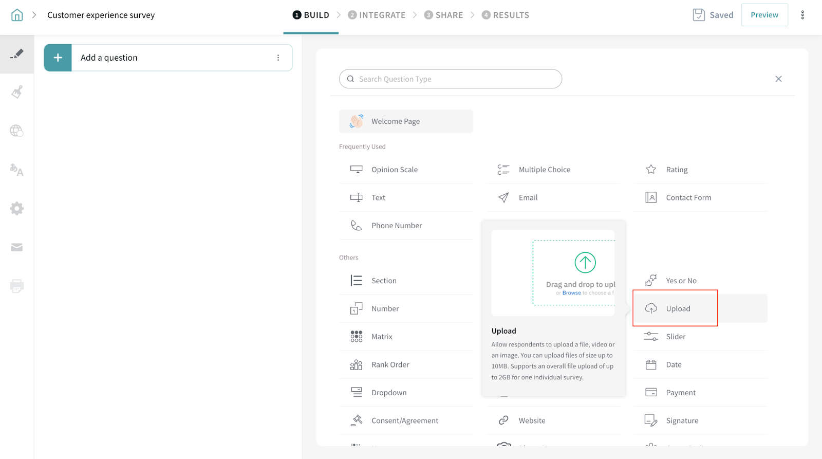 1. Open the survey and go to the Build page. Once you click on Add a question, the following screen appears. Click on the Upload Icon from the Question types.