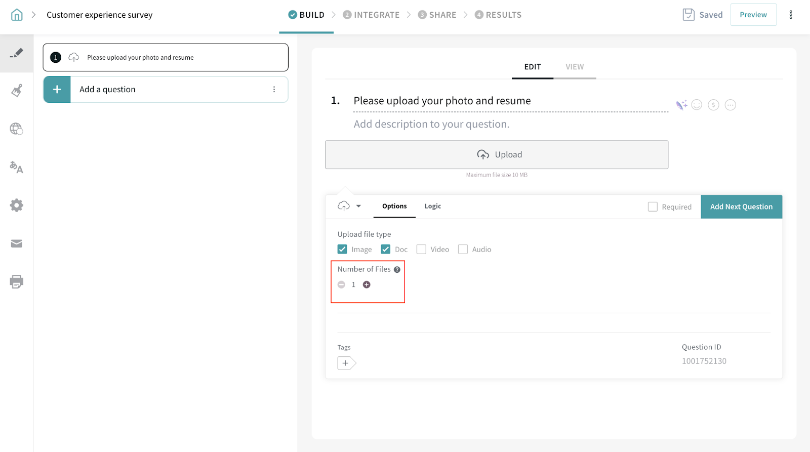 3. You can also choose the number of files you want the respondent to upload. A maximum of 5 files can be uploaded.