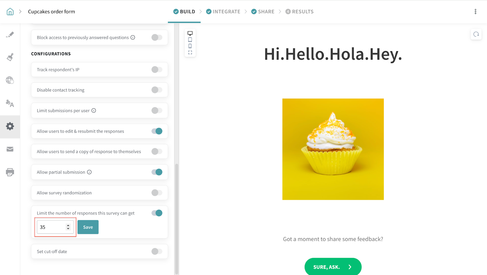 4. Add in the maximum number of participants you want to limit your survey to and hit Save. Your survey will now accept only responses within the set limit.