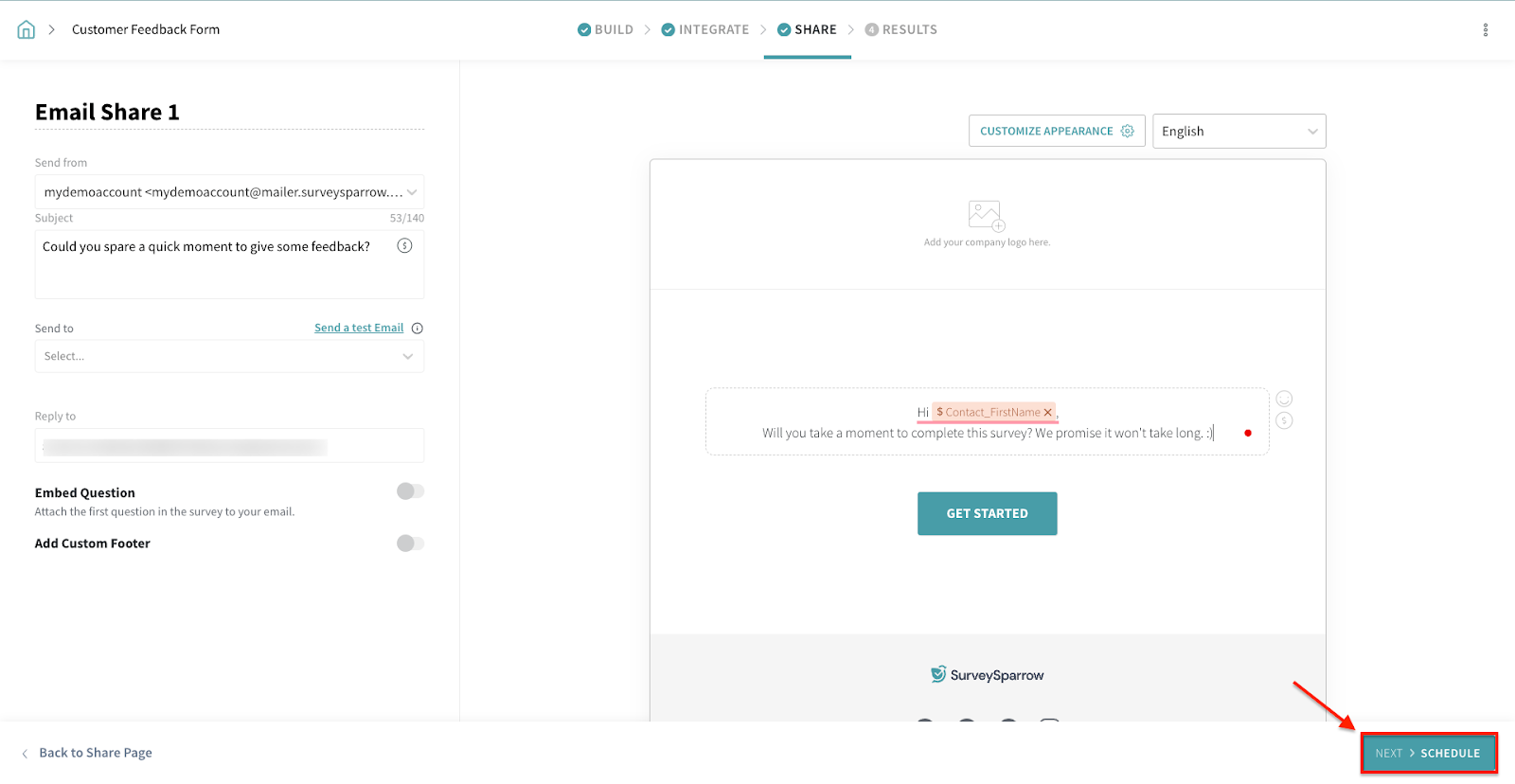 2. On the Email Share page, fill in the email header and other details for your email survey. Once done, click Schedule.