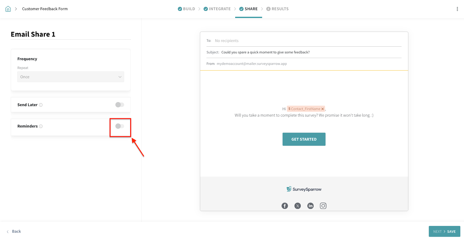 3. Now, we move to the reminder email configuration. Enable the Reminders toggle to get started.