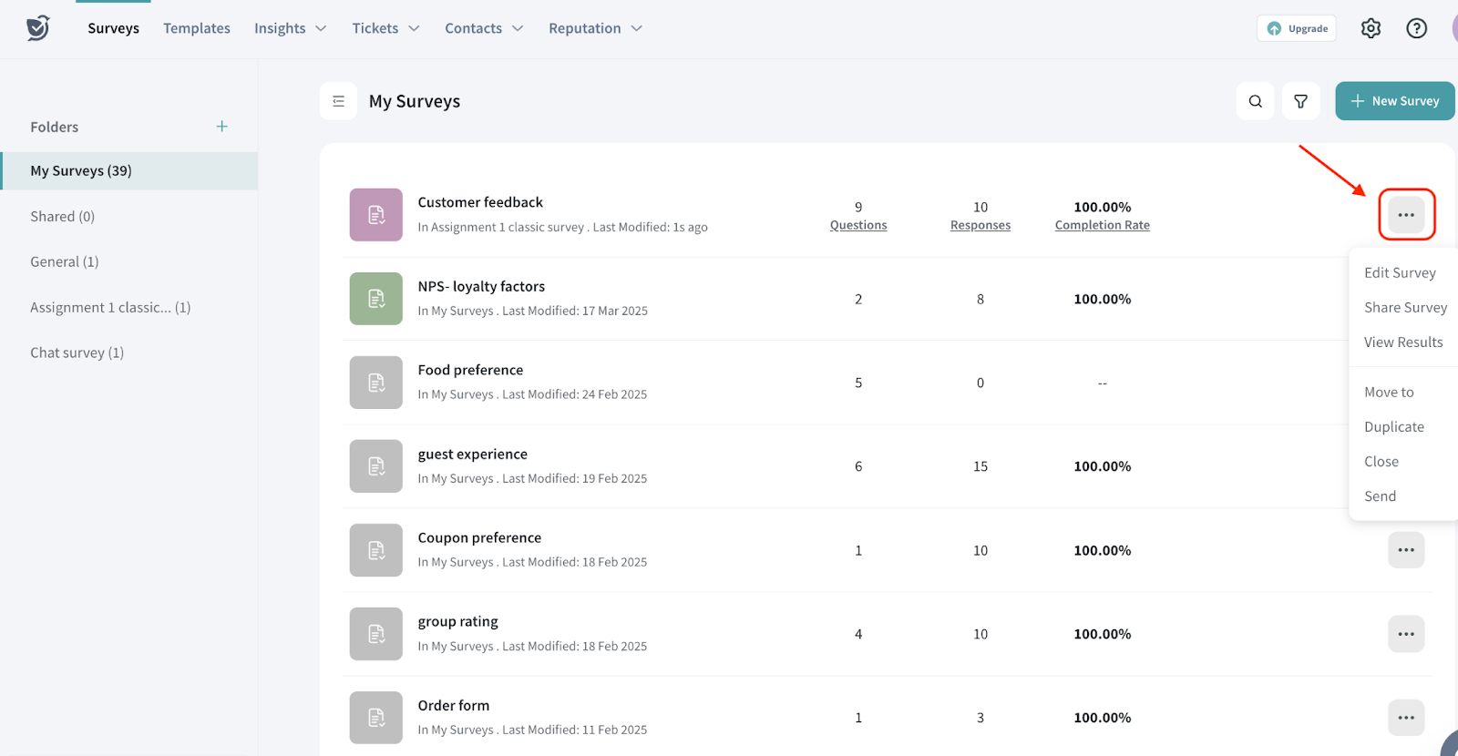 Close: Archive the survey so it no longer appears in your list. You can also check the help articles for steps to close a survey and retrieve a closed survey.