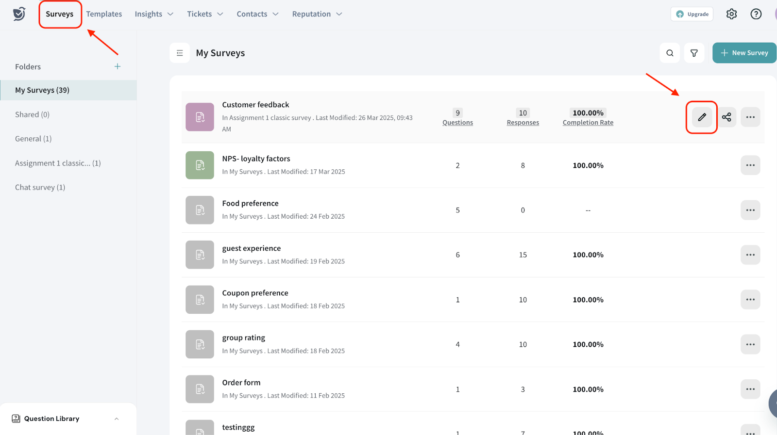 Locate the survey you want to edit and click on the edit icon.