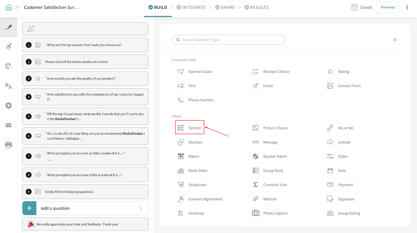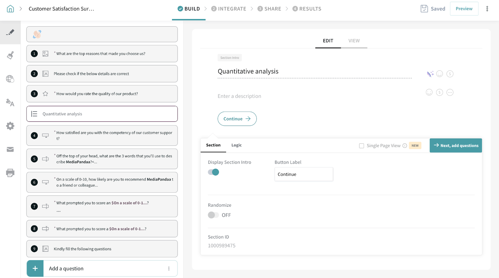 Sections let you group your survey questions based on the type of questions, respondents, answers, domain, etc. Adding sections helps to keep the transition between the questions smooth and encourages survey completion.