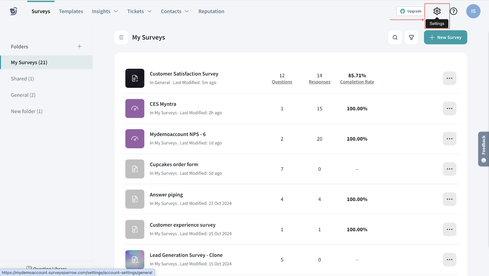 1. Log in to your SurveySparrow account and click the Settings icon on your home page.