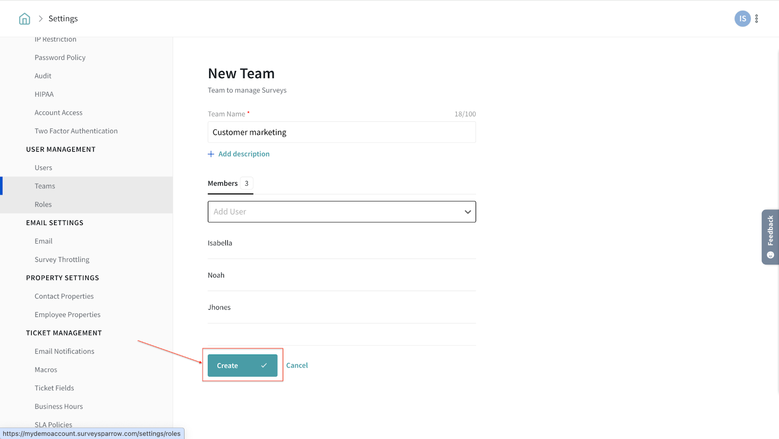 5. Once you complete adding the team members, click on the Create button.