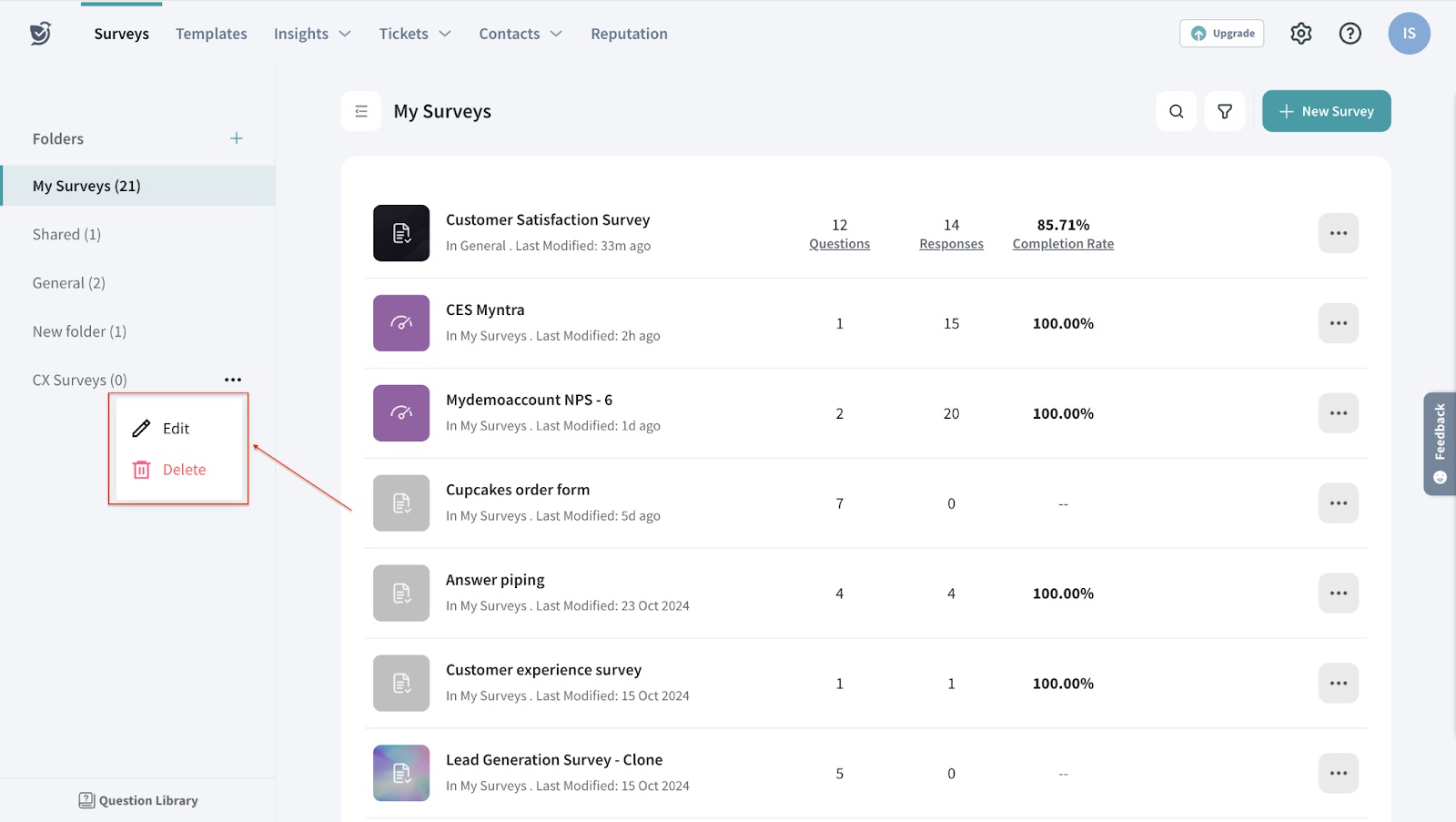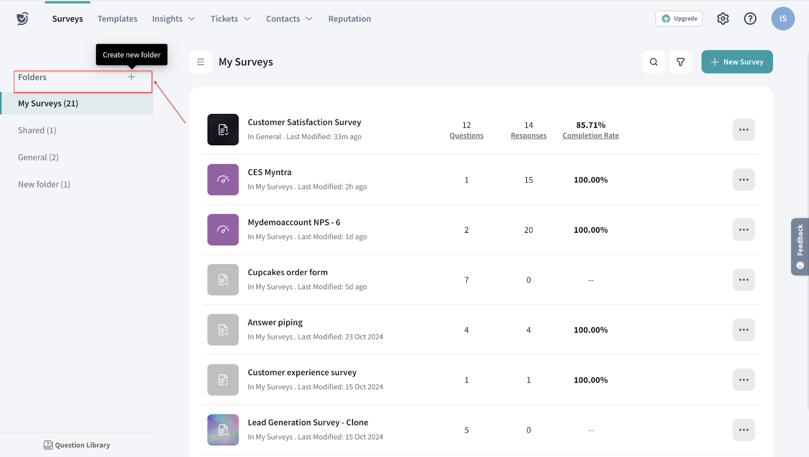 Custom folders help you organize your surveys into various categories for easy sorting. For instance, you can create different sets of surveys for various departments in your organization, like Marketing, Sales, and so on, under various folders for easy access and segregation.